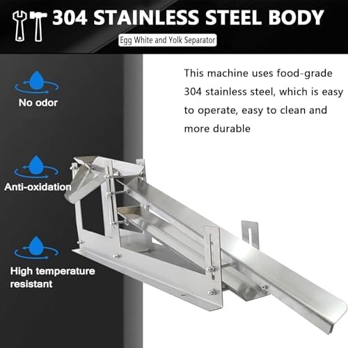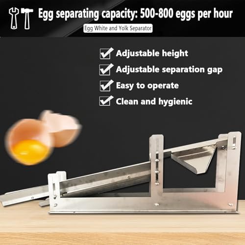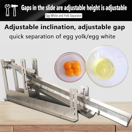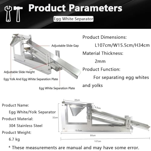 A must-have for baking enthusiasts! A commercial-grade egg white and yolk separator that separates eggs in just 3 seconds is here! * Easily handles 500-800 eggs per hour. Made of thickened stainless steel, it leaves and is easy to clean. Adjustable height and tilt angle to accommodate different egg liquid thicknesses. The egg tray handles irregularly shaped eggs. Suitable for home baking, dessert shops, and bakeries, making separation fast, accurate, and stable, unlocking more delicious baking possibilities! Features: -- Egg liquid guide tray, ready for quick separation of egg whites and yolks. -- Adjustable height egg white separation tray for easier egg separation. -- 2mm thickened steel plate for enhanced stability. -- Adjustable slide separator for more thorough and faster egg white separation. -- Adjustable nut for adjustable height and separation . -- Quickly removes irregularly shaped eggs. -- Adjustable slide height adapts to various working environments. Product Name: Egg White/Yolk Separator Product Material: 304 Stainless Steel Product Weight: 6.7 kg Product Dimensions: Length 107cm / Width 15.5cm / Height 34cm Material Thickness: 2mm Product Function: For separating egg whites and yolks