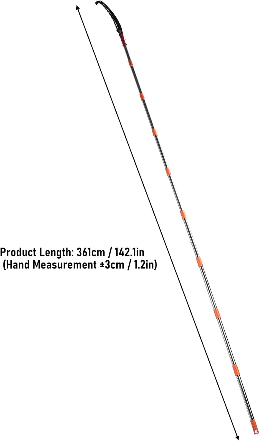 1. STRONG MATERIAL: The manual pole saw for tree trimming is made of premium thickened stainless steel, which is not easy to get rusty, has the advantage of long lasting stability. 2. EFFICIENT: The blades of the tree pruner have high hardness and sharpness for quick and easy pruning of branches that are not easily bent or broken. 3. ADJUSTABLE LENGTH: It has 9 poles, easy to install and remove, and the length can be adjusted according to your needs to cut branches of different heights. 4. HIGH SECURITY: Stability and security are greatly improved with screws to secure the blades, handle and pole. You can efficiently prune hard to high branches without having to climb a ladder, and you can also prune at ground level without having to bend or kneel, thus ensuring your security during gardening work. For security reasons, there is a canvas bag for storing the blades. Specification: Item Type: Tree Pole Pruner Material: Stainless Steel, Iron Weight: Approx. 1598g / 56.4oz Product Length: 361cm / 142.1in(Hand Measurement ±3cm / 1.2in) How to Use: The poles are installed section by section and then the pruning saw is installed and ready to use. packing list: 1 x Pruner Head 1 x Storage Protective Bag 9 x Pole 2 x Nut 2 x Screw 2 x Screwdrivers