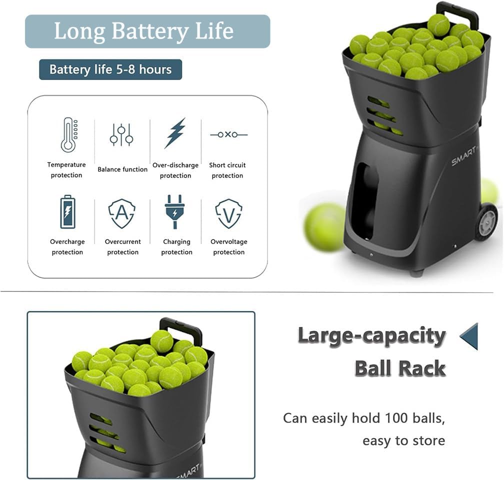 By choosing tennis pitching machine, you will have a powerful, portable, and practical training equipment to help you achieve better results and improve your skills during trainingFeatures:✔ Lightweight and portable✔ Automatic elevation adjustment✔ APP intelligent control✔ Baseline serve covers the entire court✔ Fixed-point landing ball✔ Anti-stuck ball function✔ Battery automatic protectionSpecification:Materials: ABS and metalAC power supply: 110V/220VDC power supply: 24VPower: 60WBall capacity: 100 (not included)Service frequency: 1.8 seconds -8.8 secondsProduct color: blackNet weight: 13.5kgProduct size: 32x43.5x66cm / 12.6x17x26 inchPackage includes:- 1 x Tennis Ball Machine (Not including the ball)- 1 x Charger- 1 x Remote Control- 1 x Instruction ManualPlease note:the picture is effect show, empty machine only,without Tennis ball and racket and others