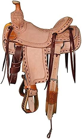 A saddle is an essential piece of equipment for horseback riding, providing both comfort and control for the rider. Crafted from high-quality materials like leather or synthetic fabrics, a well-designed saddle distributes the rider's weight evenly across the horse's back, preventing discomfort or injury. With its sturdy tree and padded panels, a saddle offers secure seating and leg positioning for optimal balance and communication with the horse. Whether you're a recreational ride Saddles are an essential piece of equipment for any equestrian, providing the crucial connection between rider and horse. Crafted with care and precision, a high-quality saddle offers comfort, support, and control for both the rider and the animal. Whether you're a seasoned competitor or a casual trail rider, finding the right saddle can make all the difference in your riding experience. With a wide range of styles and materials available, from classic English to rugged Western designs, there's a saddle to suit every discipline and preference. Invest in a well-made saddle, and you'll enjoy countless hours of enjoyable and secure riding adventures. *** Girth Cinch, Back Cinch, Saddle Pad, and Horse Bit NOT INCLUDED *** Our top selling leather colors are now available in this beautiful A-Fork wade tree roper! This wade tree roping saddle features a hand carved tooling that is designed on thick cowhide leather. The seat offers the perfect grip while roping cattle. The classic design of the saddle features shiny silver conchs and numerous ties for accessory attachments. . The wide pie horn is reinforced with a mule hide wrapping for extra stability and durability. The underside of the saddle is well-padded with fleece for maximum horse comfort. 100% Heavy Duty Cowhide Leather Hand Carved Tooling Seat Mule Hide Wrapped Horn Numerous Accessory Ties Shiny Silver Sun Conchs Adjustable Stirrups Adjustable Blevins Buckles Well-Padded Fleece Underside Wade Tree Design Wood Base Tree Wrapped In Fiberglass. If You require Wooden Tree Saddle in the same Model Kindly Drop a message. Saddle Specifications:- Color: As Per Picture. Pony Saddle Measurements:- Seat Size: 10 to 12 inches. Gullet: 5" FQHB . Skirt: 23 – 26” Horn: 2” x 5” wide. Horn: According to Picture. Swell: 6” Cantle: 3” Stirrups: 25 – 35 Weight: Approx. 24 lbs. Adult Saddle Measurements:- Seat: 14" to 18" inches Seat. Gullet: 7" FQHB . Skirt: 25 – 29” . Horn: 3” x 5” wide . Horn: According to Picture. Swell: 8” . Cantle: 4”. Stirrups: 28 – 38”. Weight: Approx. 28 lbs