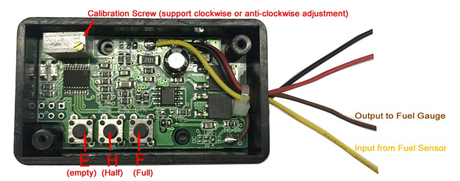 Fuel Gauge Interface Module Ohm Range Converter for Any Fuel Gauges to Match Specific Ohm RangeFuel Gauges are designed to work with a specific ohm range. Different automobile and gaugemanufacturers use different ohm ranges to correctly operate their gauges. This can causeproblems for a person who is updating their vehicle with new gauges or a new gas tank andfuel sender.This module will allow you to use your stock sender with any fuel gauge and vice versa.Features1. Acts as Interface Between Fuel Senders & Gauges2. Reads any fuel sender3. Works with any fuel gauge4. Accurately Corrects OHM Mismatch & Erratic Movement from Fuel Slosh5. Custom Calibration for empty, half level and full6. Mini Size 20(w) x 16(H) x35(L) mmInstructions1. Instructions1/Mount module in a clean dry cool position.2/Connect wires as guide photo above3/Using store mode,program and store Full,Half,Empty and “Power on” positions.4/Using power on mode,program how you want the gauge to operate when car is started.5/Operated in run mode and check.IMPORTANT NOTICEWhen adjusting the screw, move gauge from Full to Empty to avoid hysteresis error.Some gauges are very slow to move. Please allow time to stabilize.The tank sender must have the same Ground as FM101 , otherwise erratic readings will result.FM101 will convert input resistance signal to a target resistance signal, so that Fuel Gauge can work with different type/rangeof fuel sensors.The Full,Half,and Empty position can be programmed.The“in-between” positions between F,1/2,and E are calculated by the microprocessor and are linear.The“power on” gauge start position is selected from either the sender position or the programed position.The output is a npn pulse width modulated signal which may cause“buzzing”in undamped gauges.