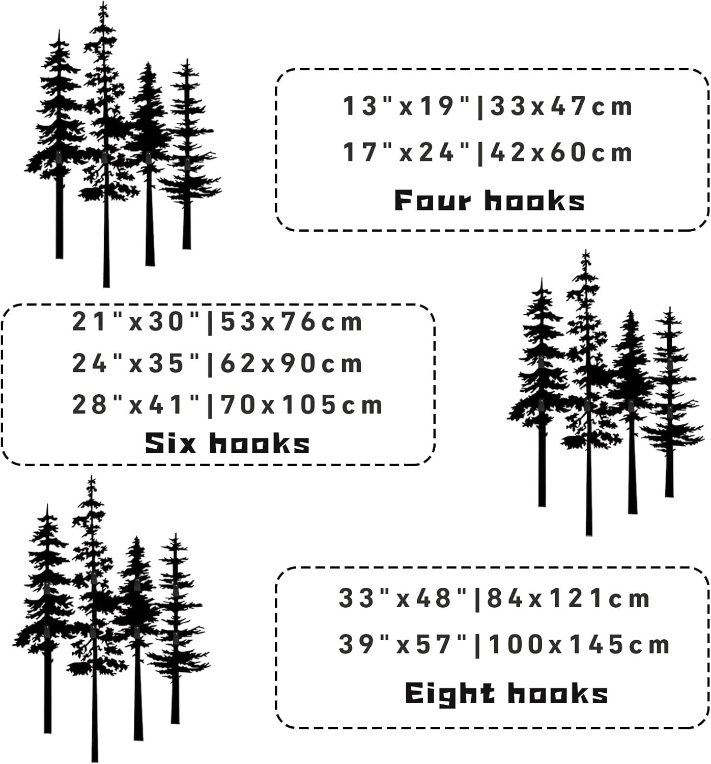 Metal Wall Pine Tree Coat Rack, Wall Mounted Coat Hooks Hanger, Pine Trees Wall Mounted Coat Rack, Metal Tree Hat Hanger, Key Holder, Entryway Wall Decor We are committed to producing excellent works of art, only for your satisfaction. Elegant Artistic Atmosphere Bringing art to life in this way, when this coat rack is placed in your home, it will bring a unique atmosphere to your home. Enhance your space with this stunning coat rack. Crafted with intricate details, this coat rack adds a touch of elegance to any room. As a focal point, this coat rack showcases the beauty of nature in a unique and artistic way. Excellent Quality Artwork This is a very fashionable design, the coat rack is easy for you to match well with various styles of occasions. Also it can keep harmonious with house styles, which can bring a refreshed feeling. Size: 13"x19"|33x47cm(Four Hooks) 17"x24"|42x60cm(Four Hooks) 21"x30"|53x76cm(Six Hooks) 24"x35"|62x90cm(Six Hooks) 28"x41"|70x105cm(Six Hooks) 33"x48"|84x121cm(Eight Hooks) 39"x57"|100x145cm(Eight Hooks) Material: Metal Package Includes: 1 x Metal Wall Pine Tree Coat Rack; 2 x Installation Kit Notice: 1. Due to the different lighting environment, the color of the product may be slightly different from pictures 2. Please allow 1-3% size difference according We are always committed to giving you the best shopping experience, please contact us when you have any purchase questions.