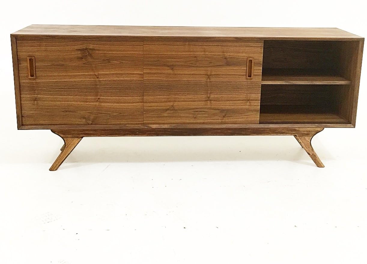 Gorgeous mid century style 72" Walnut Credenza. Handmade in our studio in Los Angeles. 3 sliding doors with teak handles and 6 shelves. Media ready. Dimensions: 72"W X 16"D X 30"H