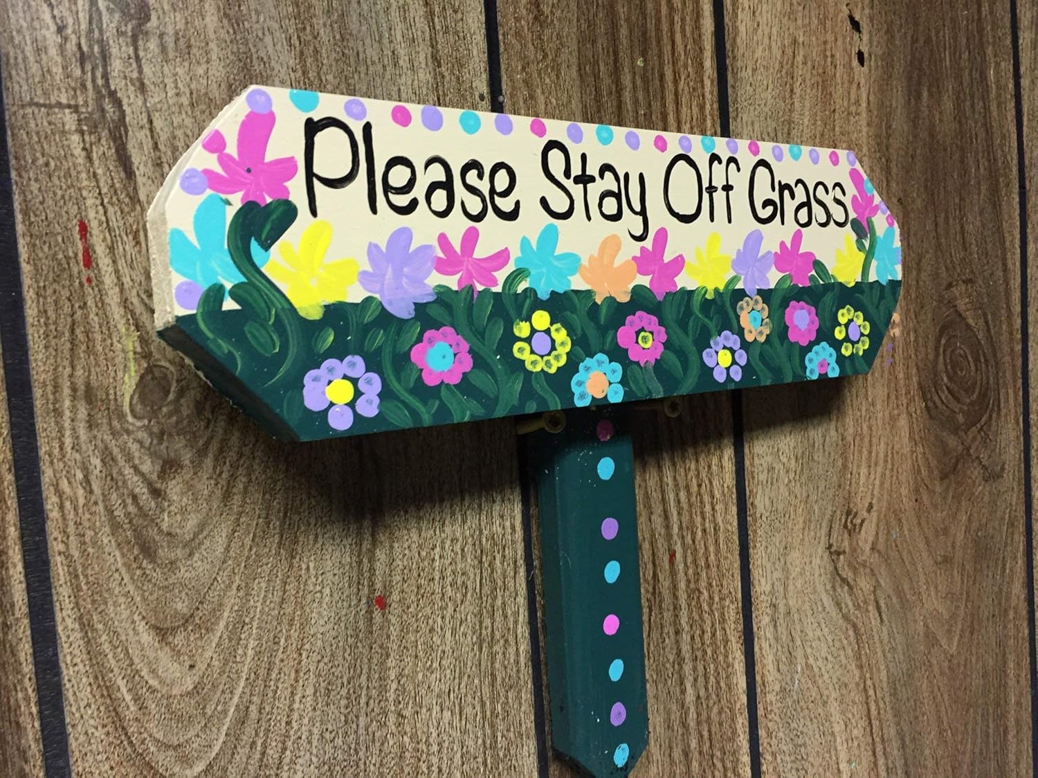 This "Please Stay Off Grass" sign is made from 3/4" pine. I've hand painted the sign using exterior acrylic paint and several coats of a clear acrylic sealer, they will hold-up well in all weather conditions. The sign is attached to a painted pointed wood stake. Weather-proof screws are used. It is a small sign, measuring 11 1/2" long x 9" tall. This sign is a cute little reminder to the local dog walkers. Hopefully it will do the trick!