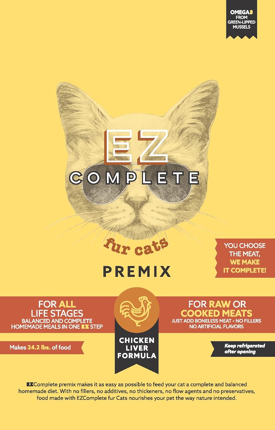 DESCRIPTION: An EZ solution for a balanced and complete homemade cat food diet, Raw or Cooked, in One EZ Step Mix with your own raw or cooked meat to make a Homemade Cat Food Diet. A formula based on the Prey Model concept with the addition of other critical components and their strong belief in staying in line with their natural diet A meal for the True Carnivore. Re-sealable pouch BENEFITS/FEATURES: Creates a complete and balanced species appropriate food for cats when combined with raw or cooked meat. Formulated specifically to meet the health needs of cats, not other pets. Includes omega 3 sourced from New Zealand green lipped mussel providing a unique combination of anti-oxidants, anti-inflammatory omega 3s and rich with glucosamine/chondroitin Added taurine, an essential nutrient for all cats for a healthy heart, digestive system, ocular & reproductive functions. All natural. 100% human grade & pharmaceutical grade ingredients Manufactured in a human grade facility certified next generation cGMP and NSF a Meets AFFCO guidelines for all life stages. Kittens to Adult to Senior Cats No by-products, fillers, chemicals or GMO. No artificial additives, colors, flavors, preservatives, fillers, chemical, thickeners or flow agents. Grain FREE HEALTH BENEFITS OF A RAW MEAT DIET FOR CATS: Aids in prevention / maintenance of diabetes, food allergies, digestion health, urinary health, kidney health, dental health, bowel health, weight management / obesity, coat and skin health, energy levels. COUNTRY OF ORGIN: Made in the USA # OF SERVING PER PACKAGE: Based on feeding 4 oz per day - 450g pouch produces approx 96 day supply / 225g pouch produces approx 48 day supply