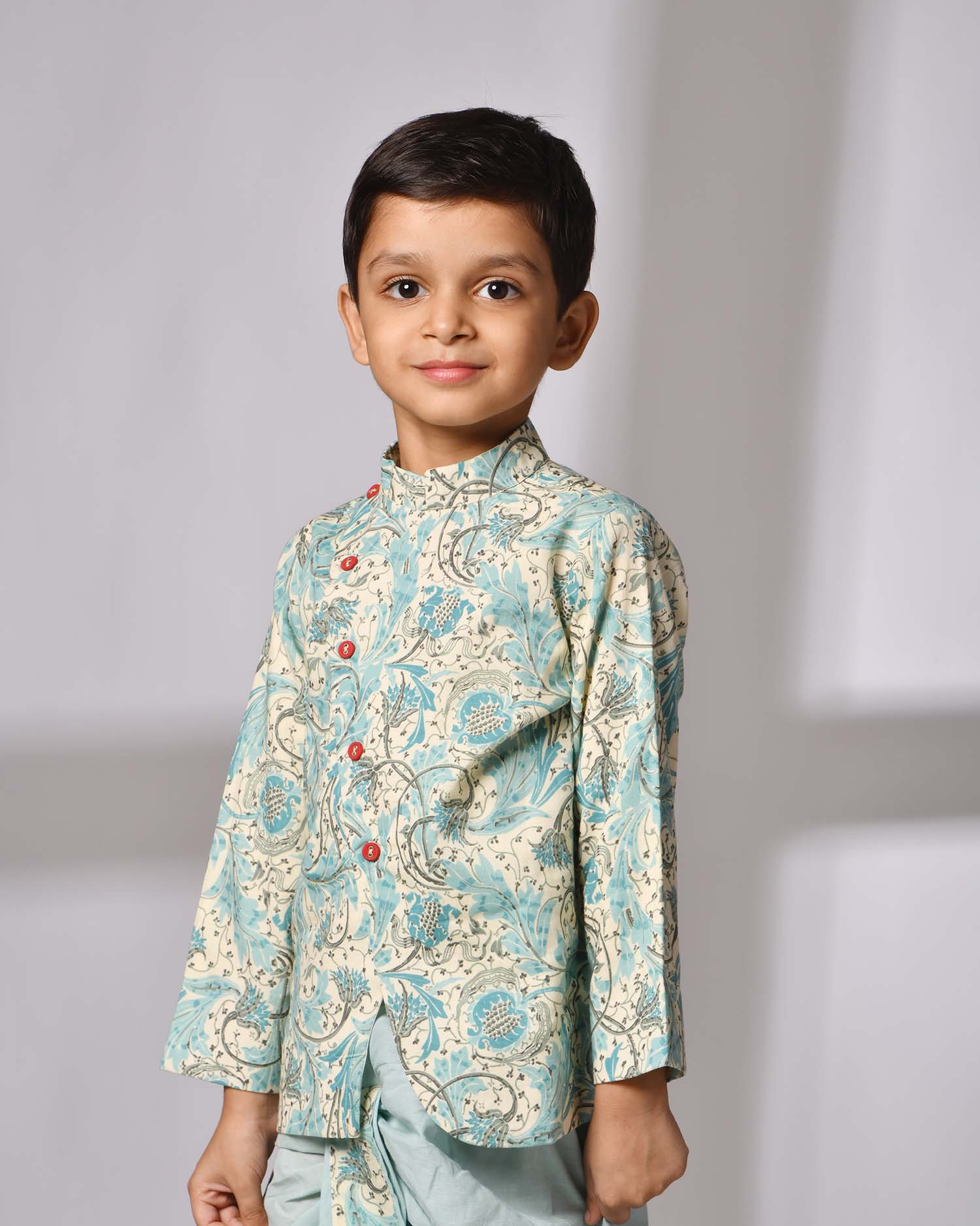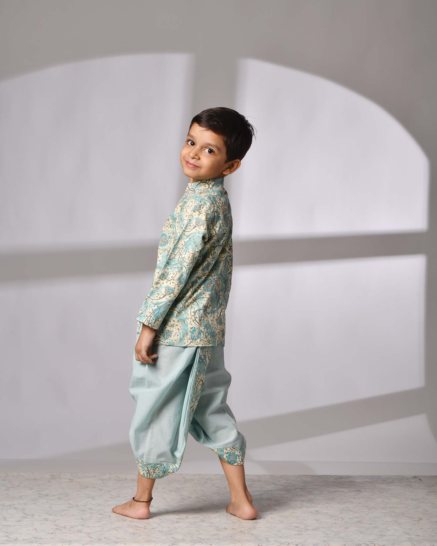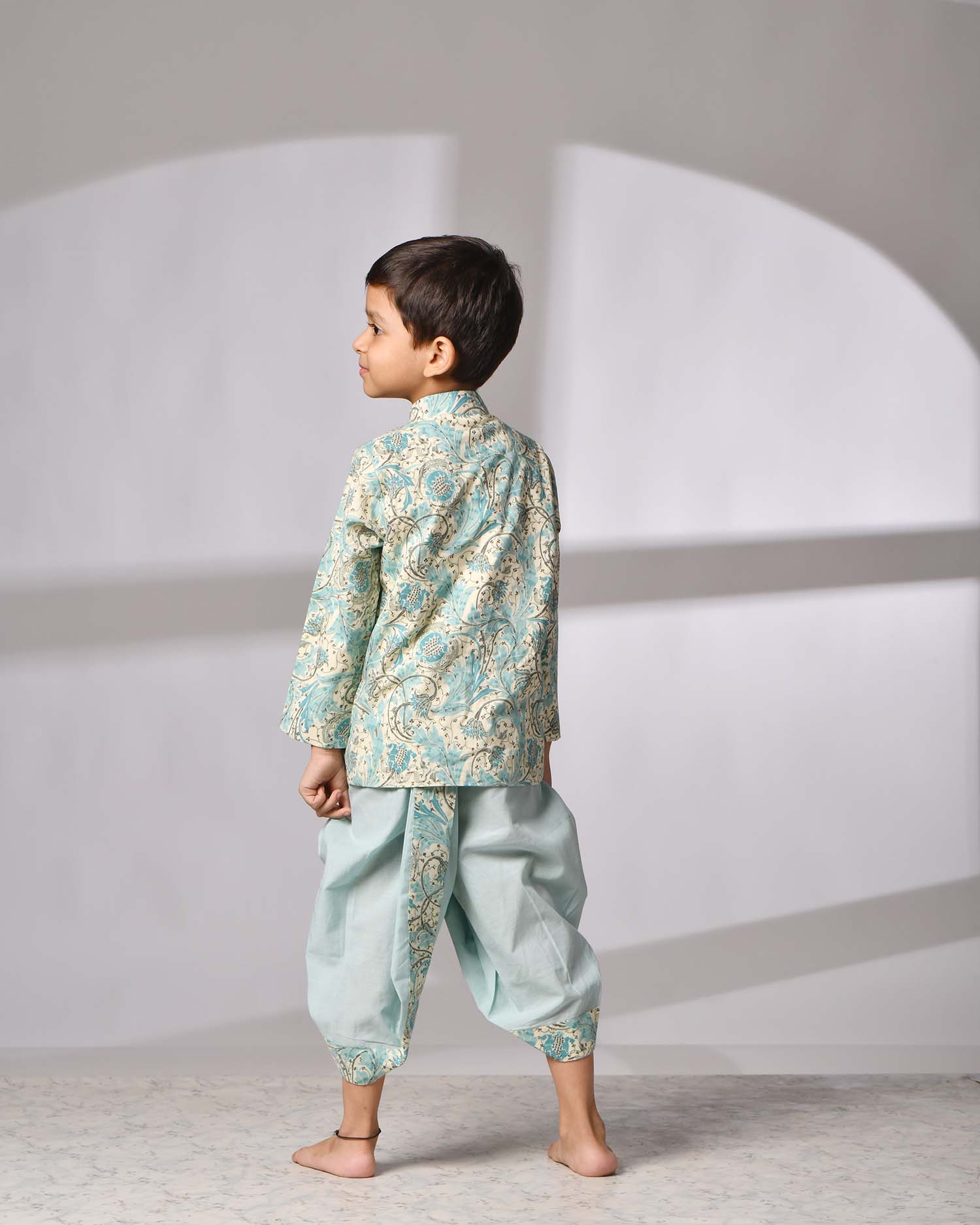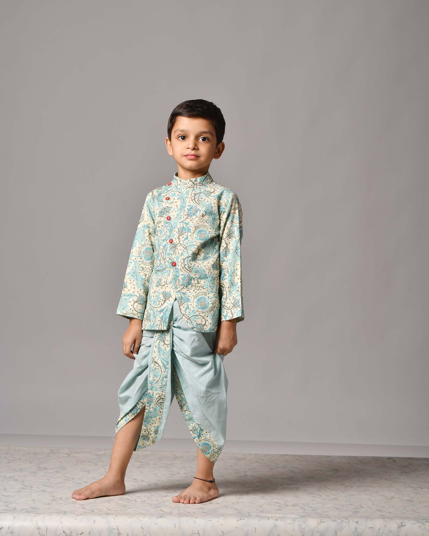 The sky blue kurta is adorned with intricate detailing and exquisite embellishments, adding a touch of regal elegance to his attire. The coordinating dhoti features matching accents, completing the traditional look with finesse.