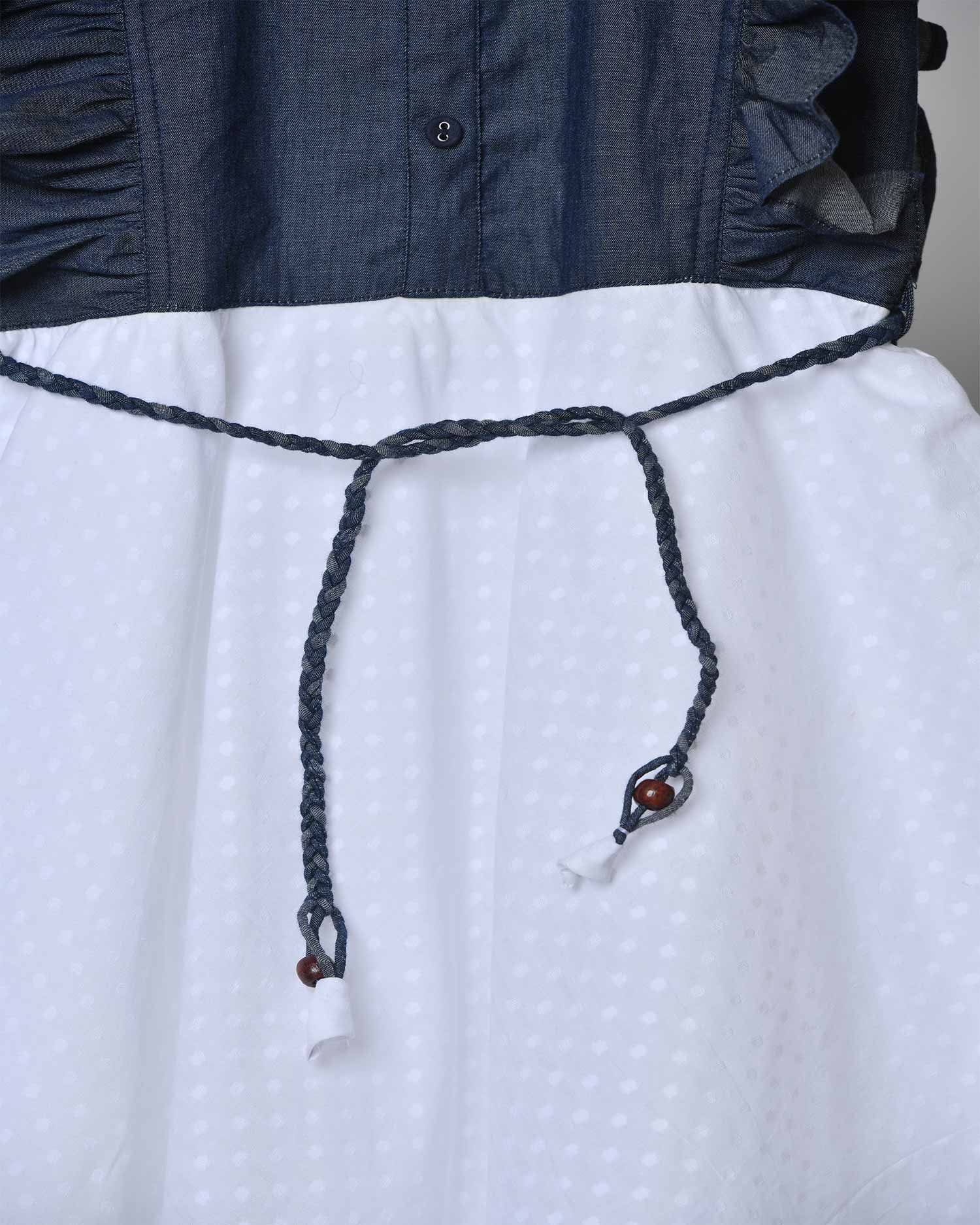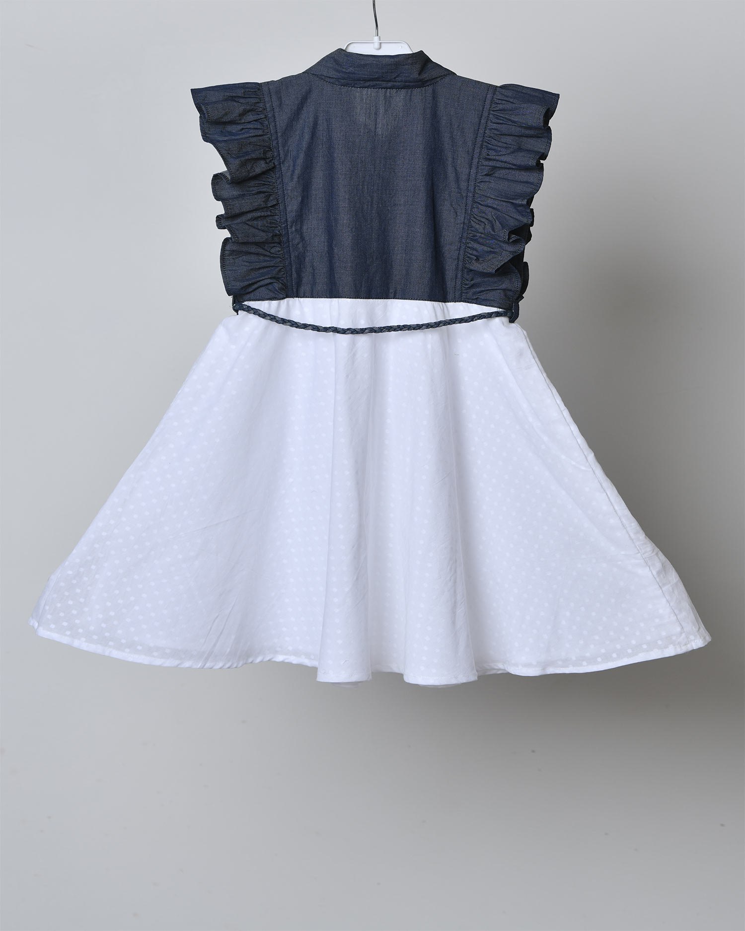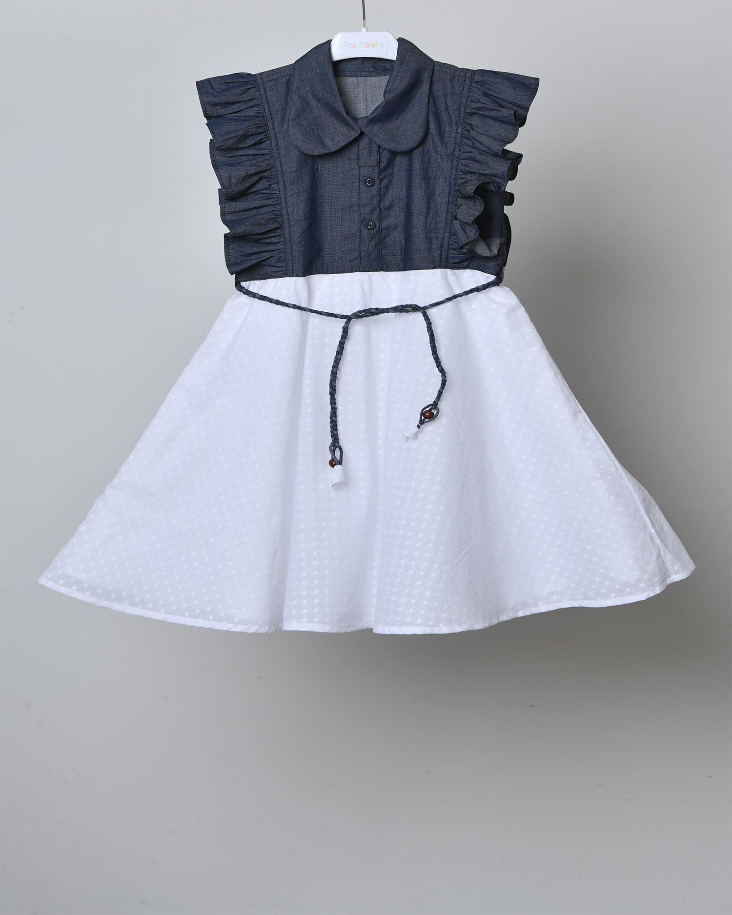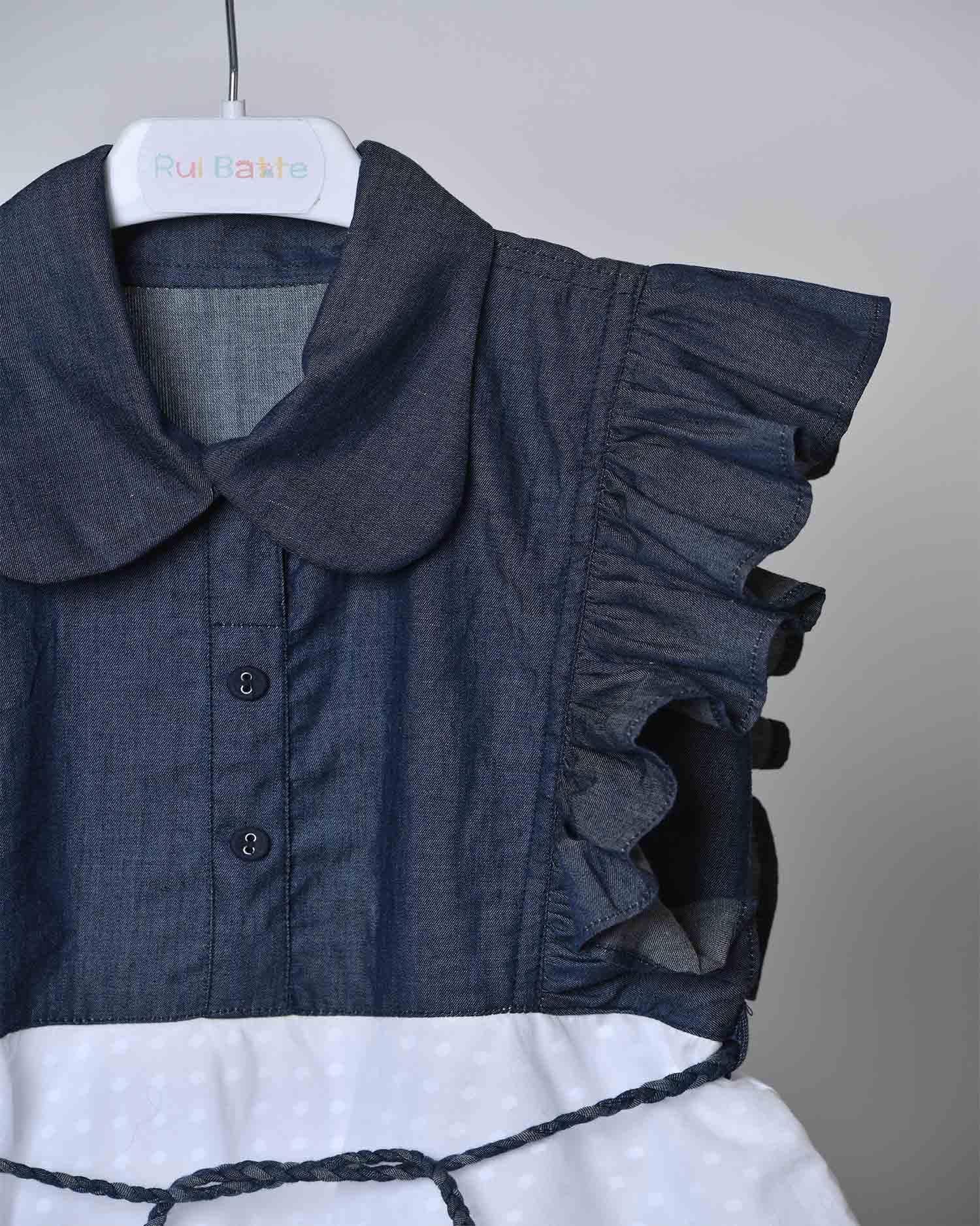 Discover elegance and playfulness combined in the Blue Denim and White Dobby Frock from Rui Batte, a leading name in children’s party wear. Crafted with meticulous attention to detail, this frock blends comfort with style, making it ideal for both casual outings and special events. Crafted from premium cotton, the frock boasts a soft and breathable texture, ensuring all-day comfort for your little one. The striking combination of navy blue denim and crisp white dobby fabric adds a touch of sophistication, while the back tie-up detail and delicate frills at the sides elevate its charm. Designed with practicality in mind, this frock is easy to care for with a gentle wash recommendation, ensuring longevity and vibrant colors wash after wash. Whether it’s a birthday party, family gathering, or a day out, the Blue Denim and White Dobby Frock is a must-have in every young fashionista’s wardrobe. Embrace timeless elegance and contemporary flair with Rui Batte’s commitment to quality and style, making every moment memorable for your little one.