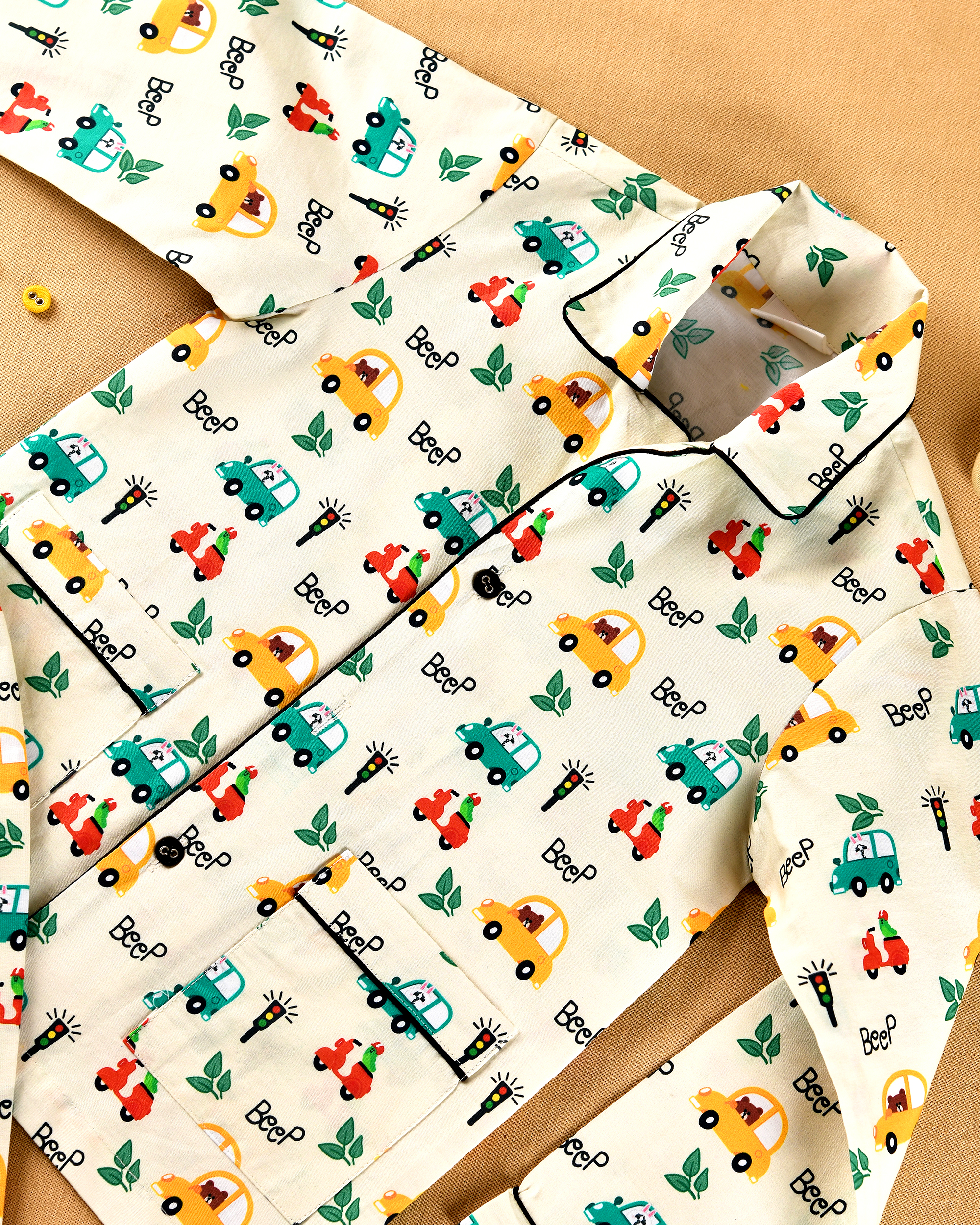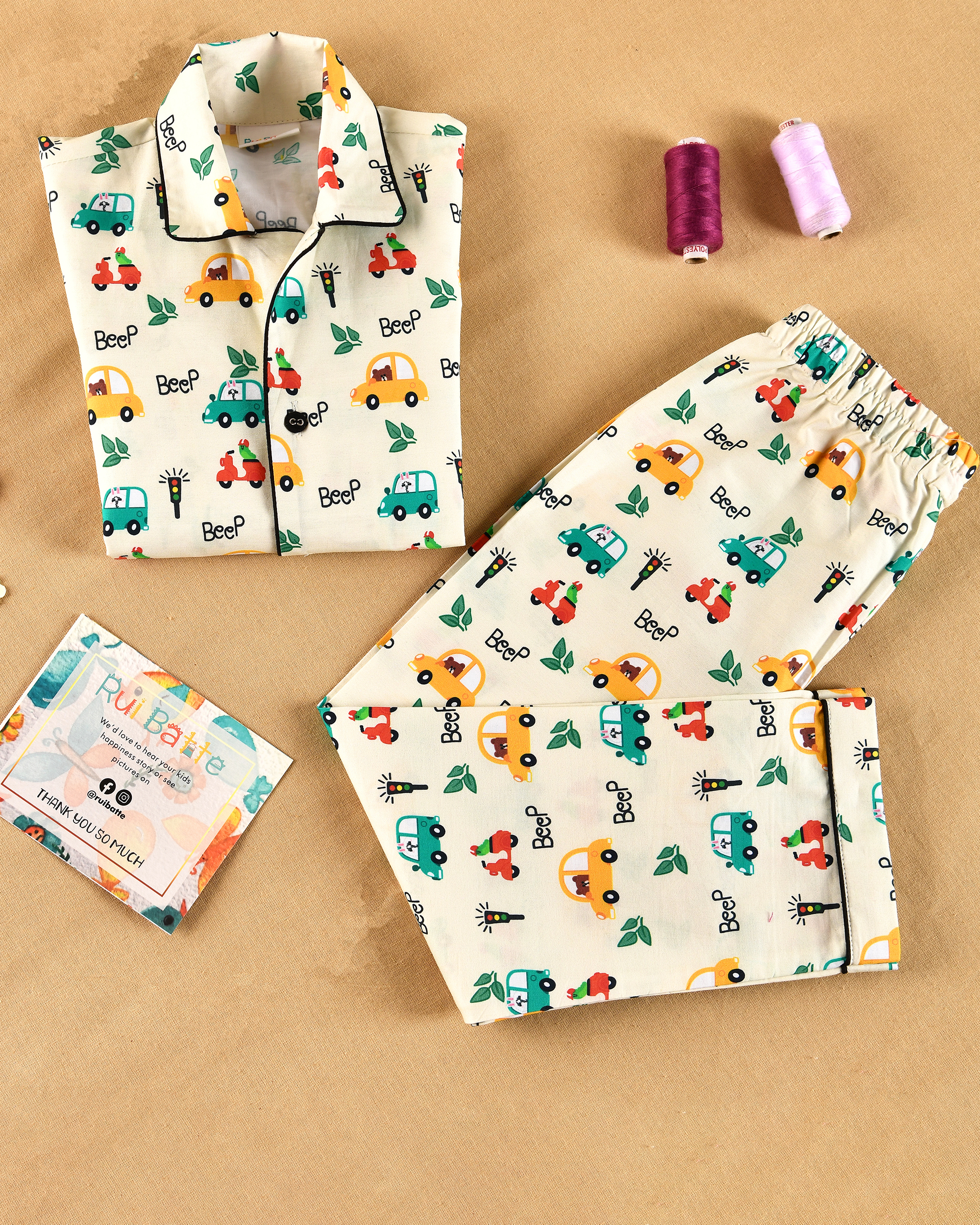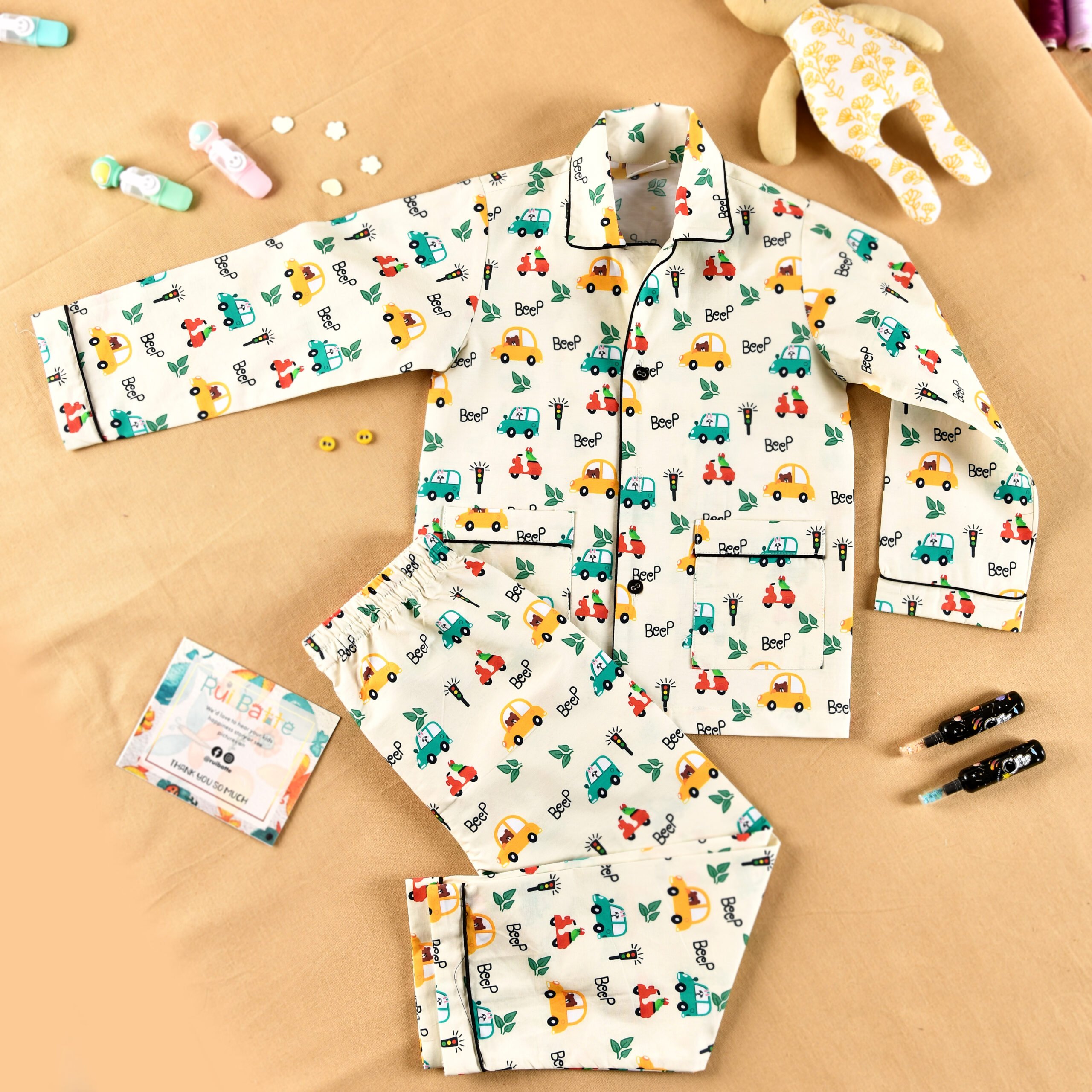 Rui Batte presents a comfortable poplin night suit designed with a fun car print that kids will love. Made from soft, breathable poplin fabric, this sleepwear ensures a smooth, lightweight feel for a restful night’s sleep. The playful design and skin-friendly material make it perfect for everyday use, keeping kids cozy, relaxed, and stylish even at bedtime.