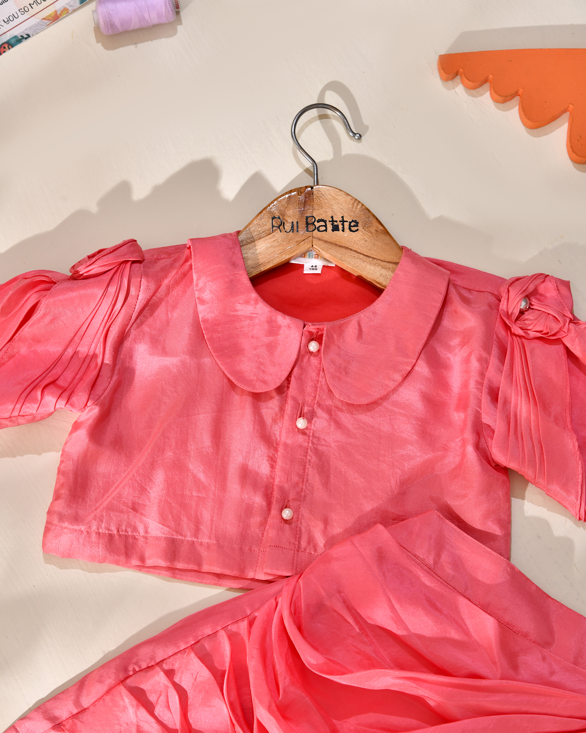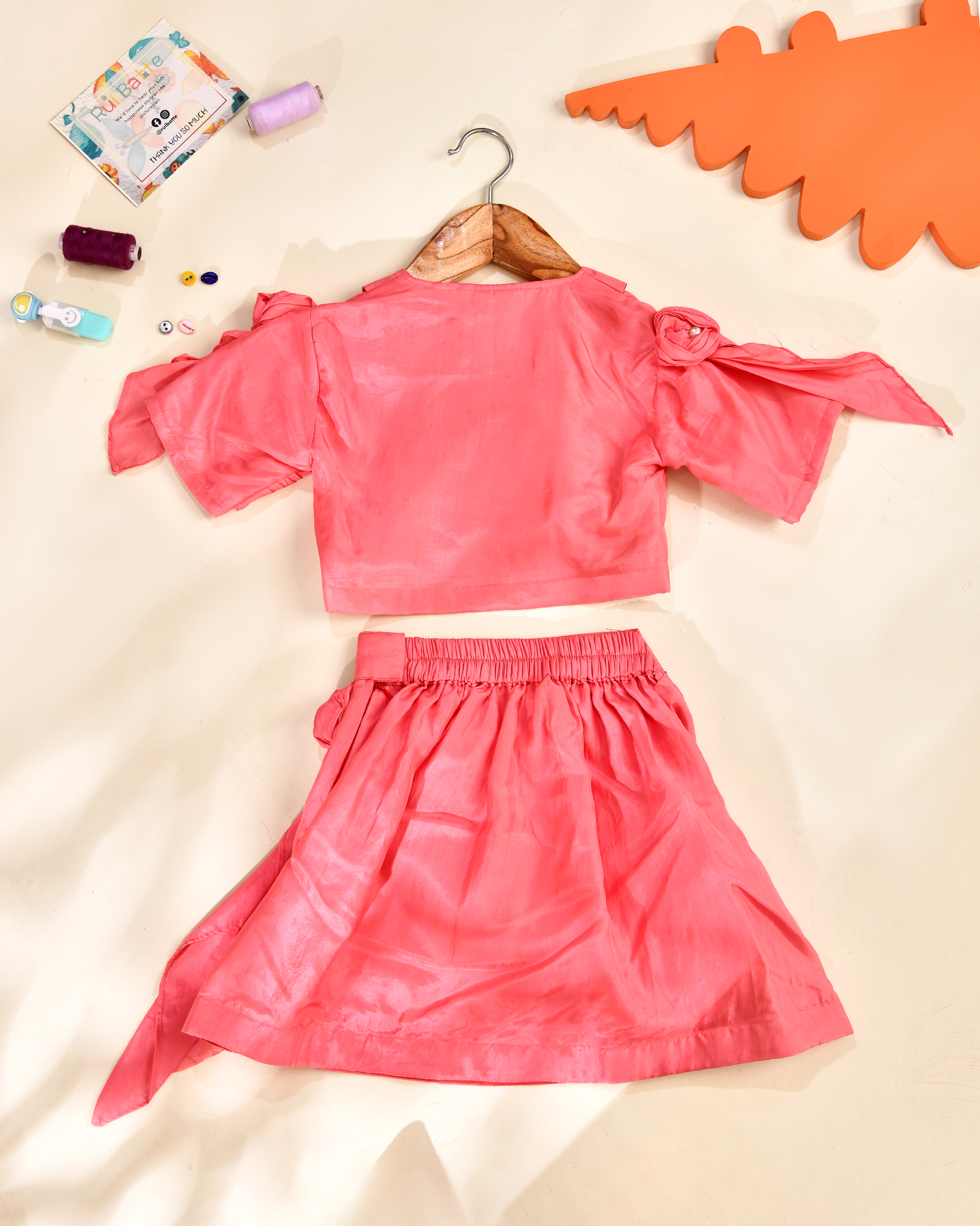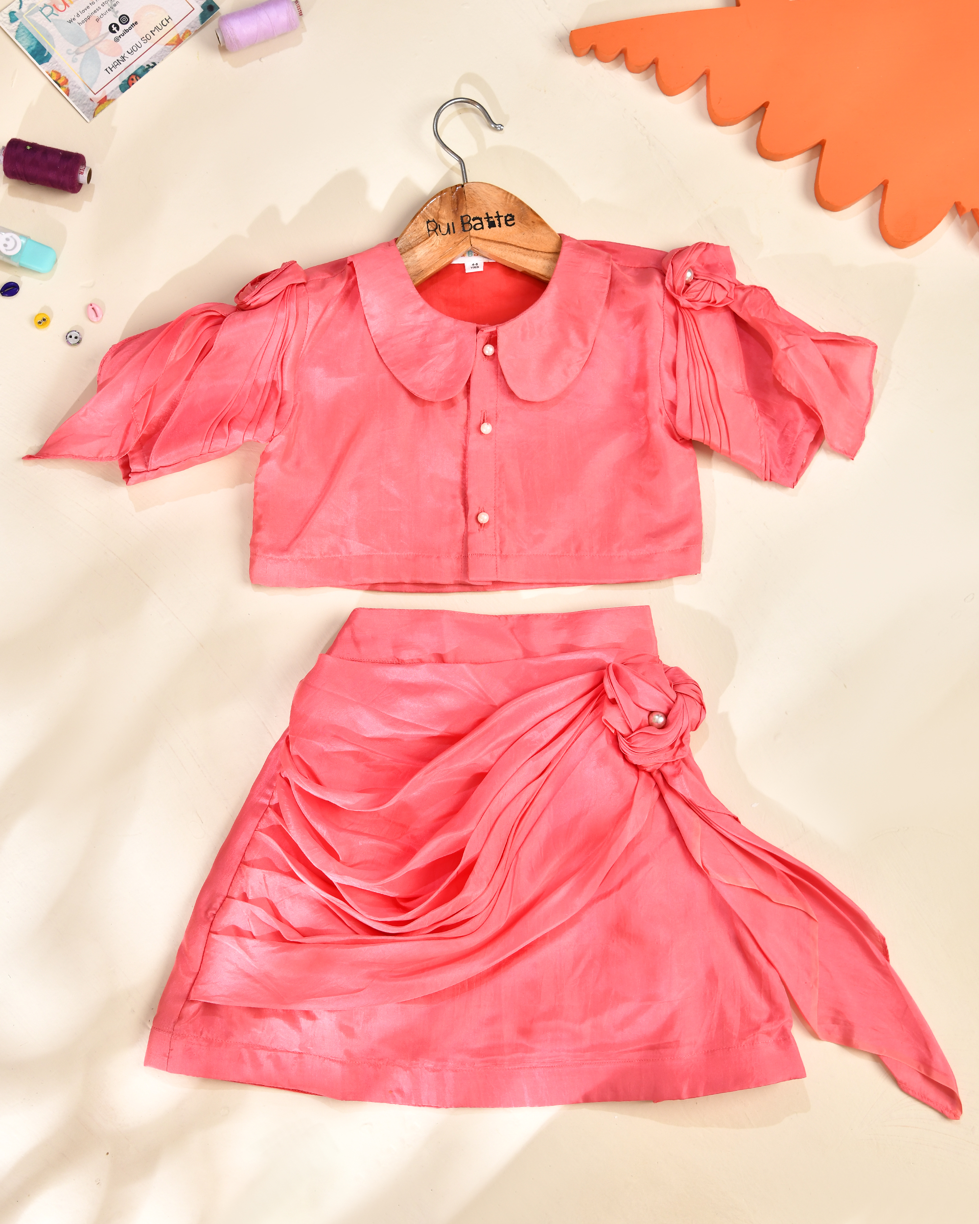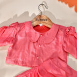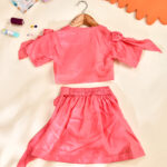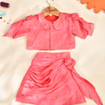 Rui Batte presents a stylish modal lehenga set featuring a designer short skirt paired with a modern crop top. Crafted from soft, breathable modal fabric, this outfit offers a smooth, lightweight feel that keeps kids comfortable throughout the day. The contemporary silhouette blends ethnic charm with trendy style, making it a perfect choice for weddings, festive events, and special celebrations.