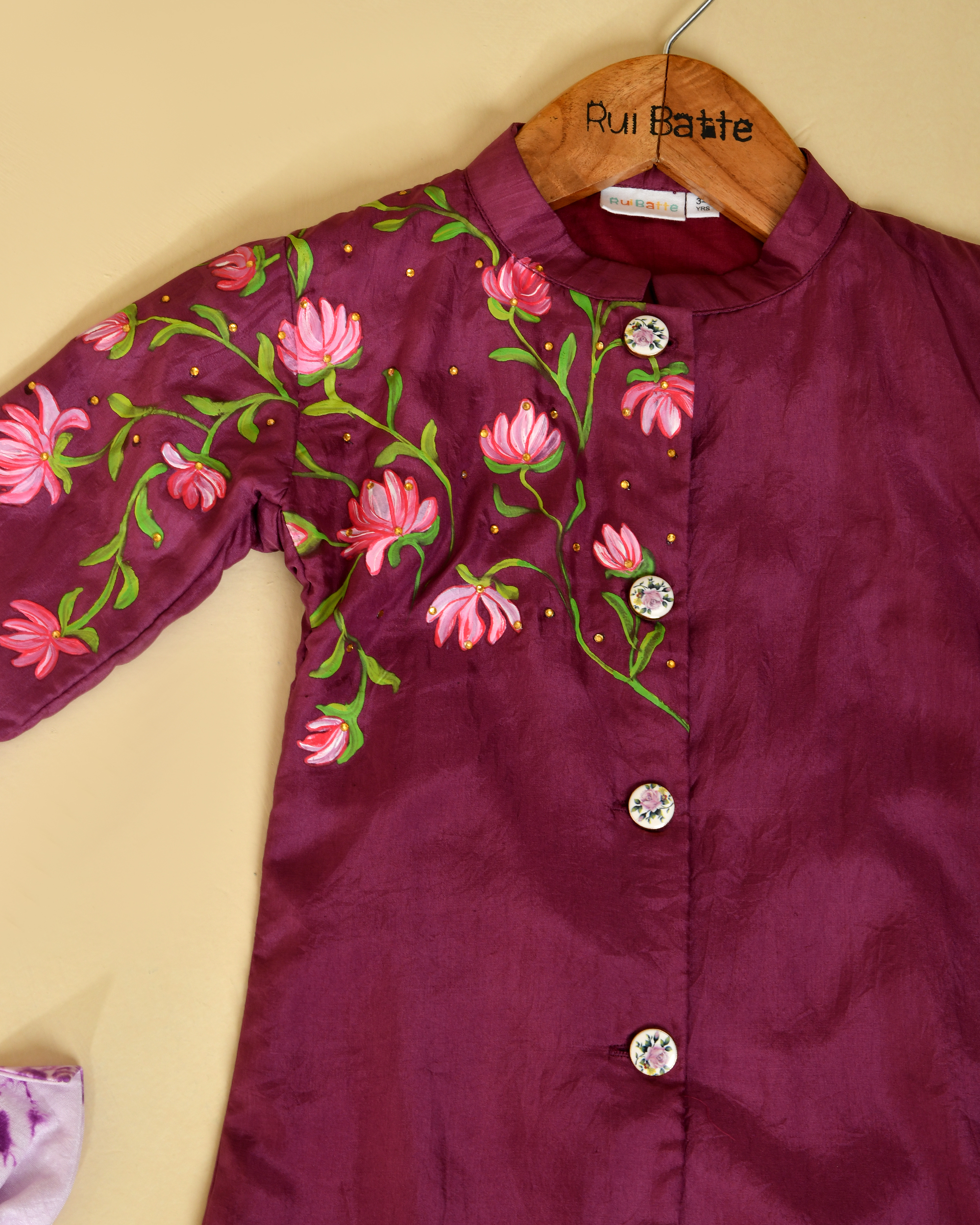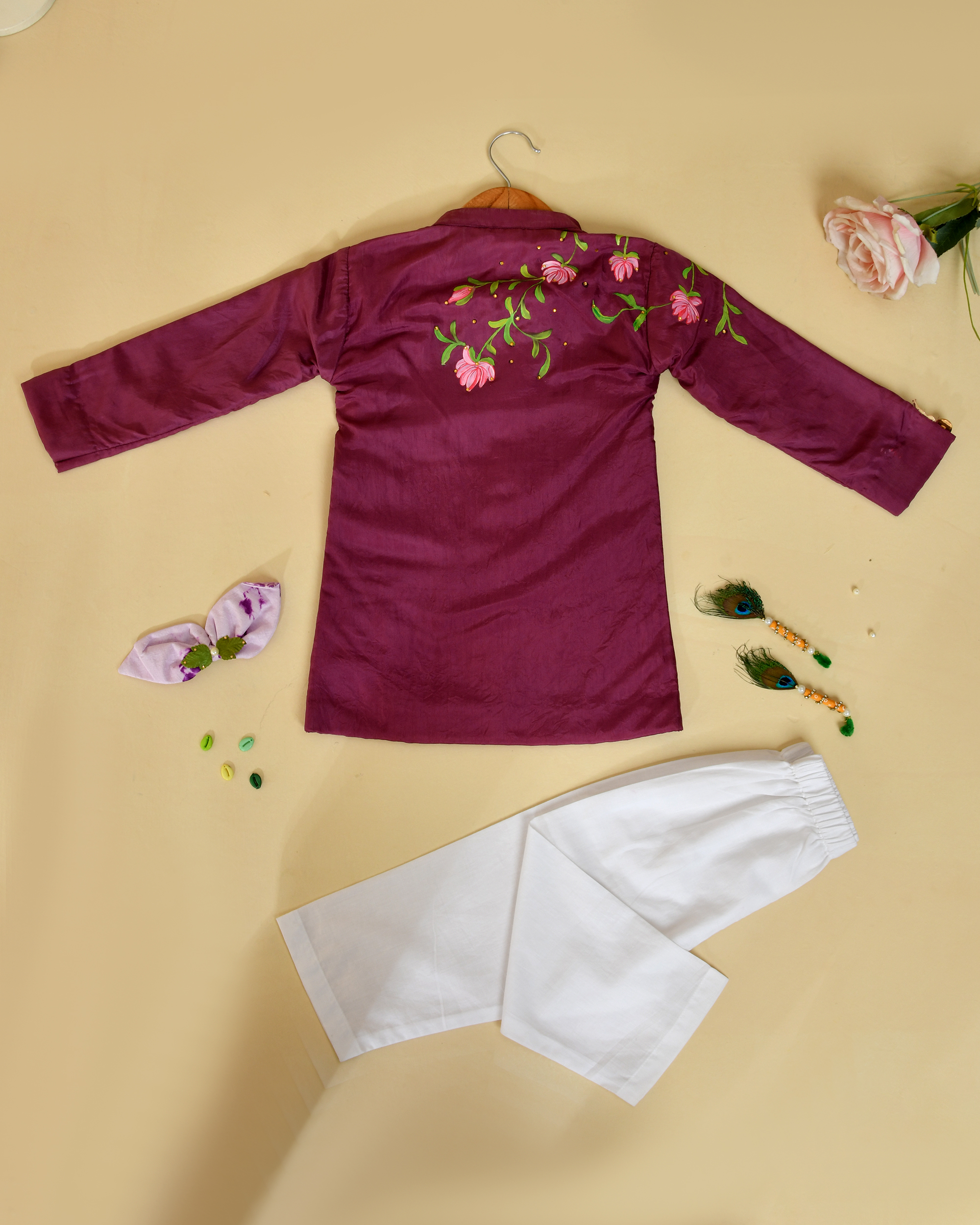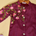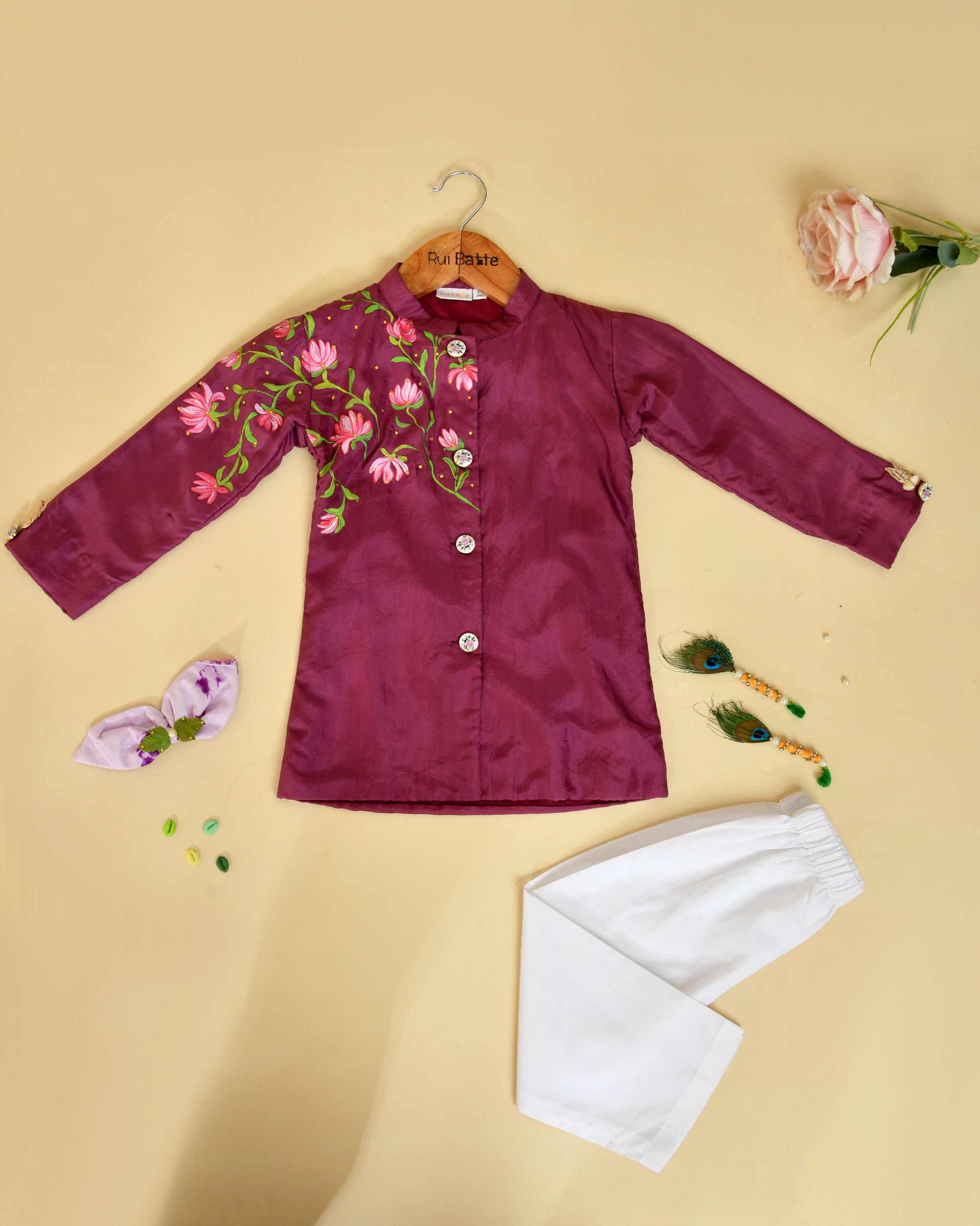 Rui Batte presents a beautifully crafted lotus handpainted Kurta Pajama set for kids, featuring a soft modal kurta paired with a breathable cotton pajama. Designed for comfort and elegance, the outfit showcases delicate lotus artwork that reflects purity and traditional charm. Made with eco-friendly, skin-safe fabrics, this kids ethnic wear is perfect for festivals, family functions, and cultural celebrations.