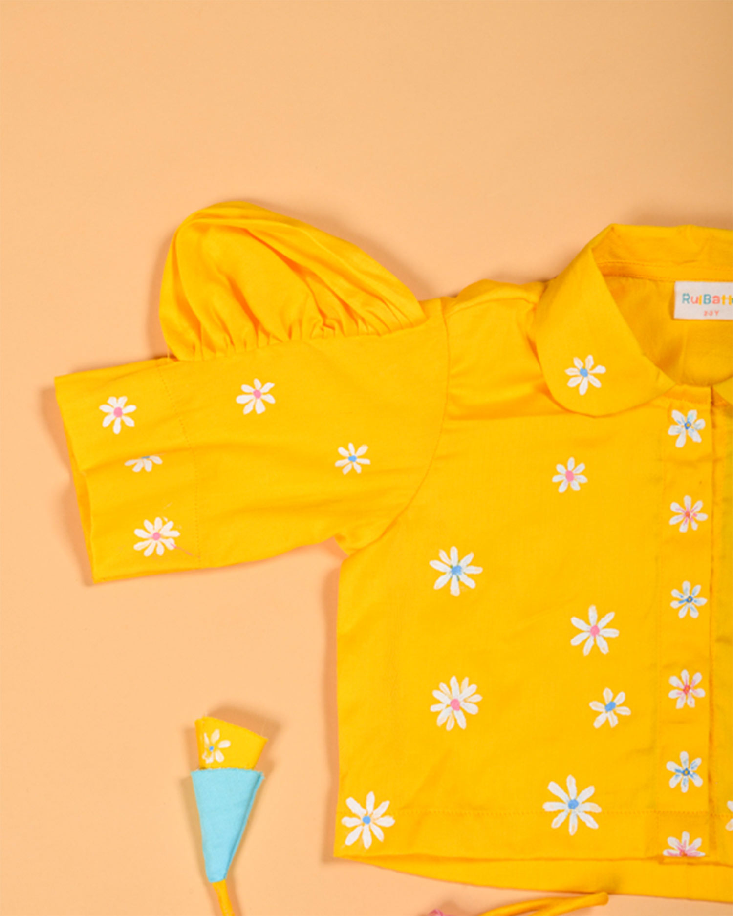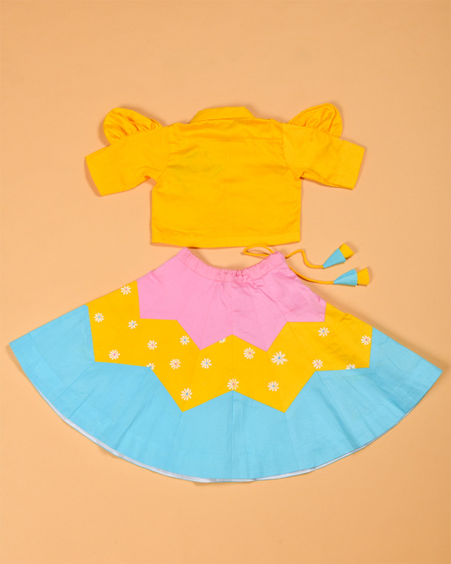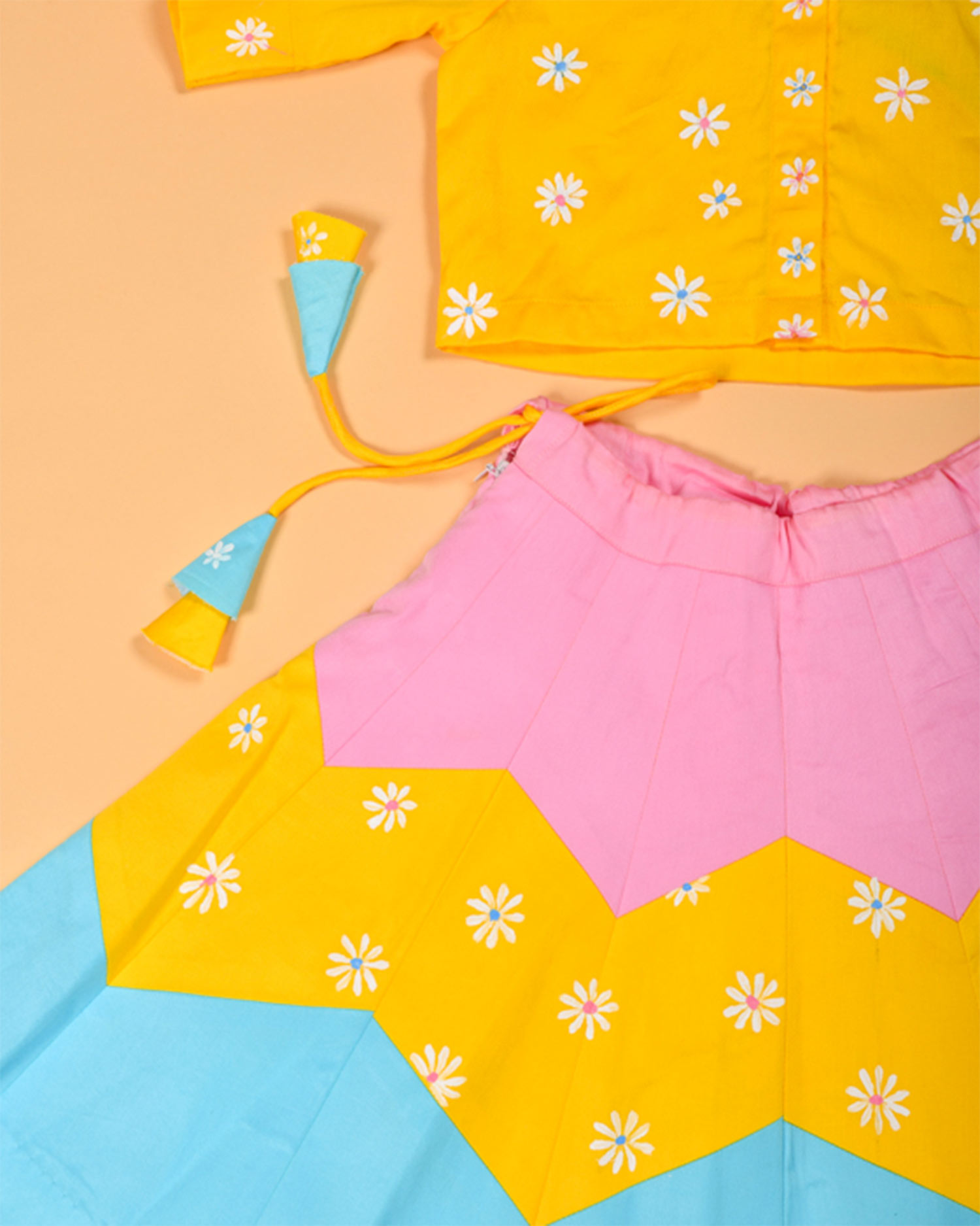 Elevate your child’s wardrobe with our exquisite Tri-color Flower Lehenga Choli, meticulously crafted for moments of celebration and joy. Hand-painted with artistic finesse, this ensemble blends shades of blue, pink, and yellow in soft cotton fabric, ensuring comfort and gracefulness with every wear. The lehenga showcases delicate floral motifs that add a whimsical touch, making it a standout choice for festive occasions. Paired with a contrasting yellow Balloon choli top, adorned with playful balloon prints, it strikes the perfect balance of tradition and modern flair. Carefully designed for easy maintenance, our lehenga choli recommends a gentle wash and advises separating light colors to preserve its vibrant hues over time. Ideal for young girls who adore elegance and comfort, this ensemble from Rui Batte promises to be a cherished addition to their wardrobe, offering both style and practicality.