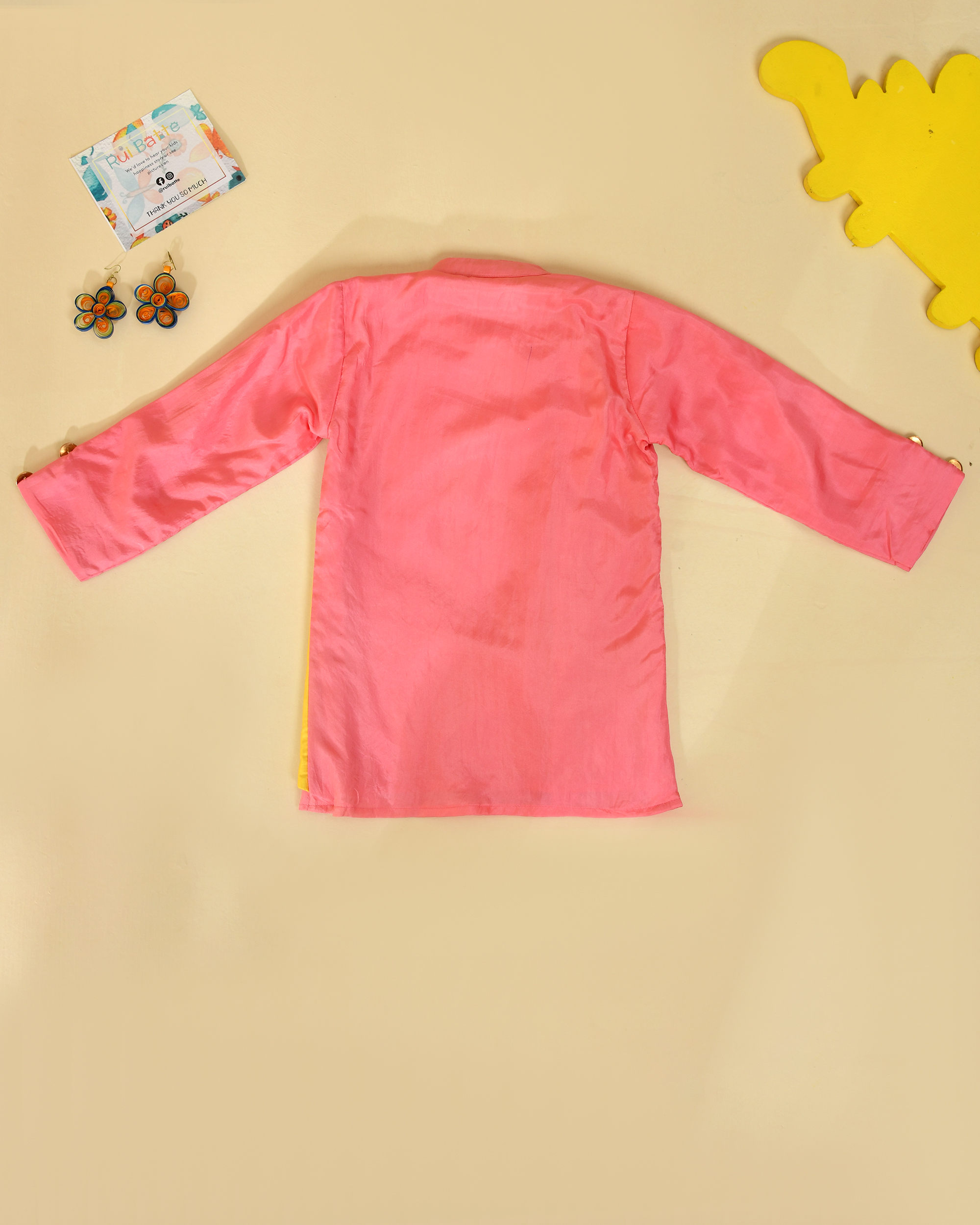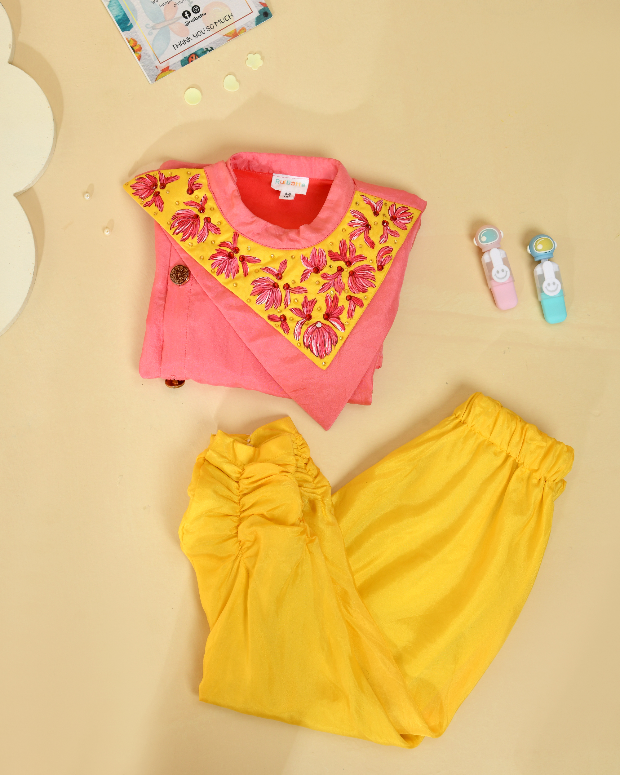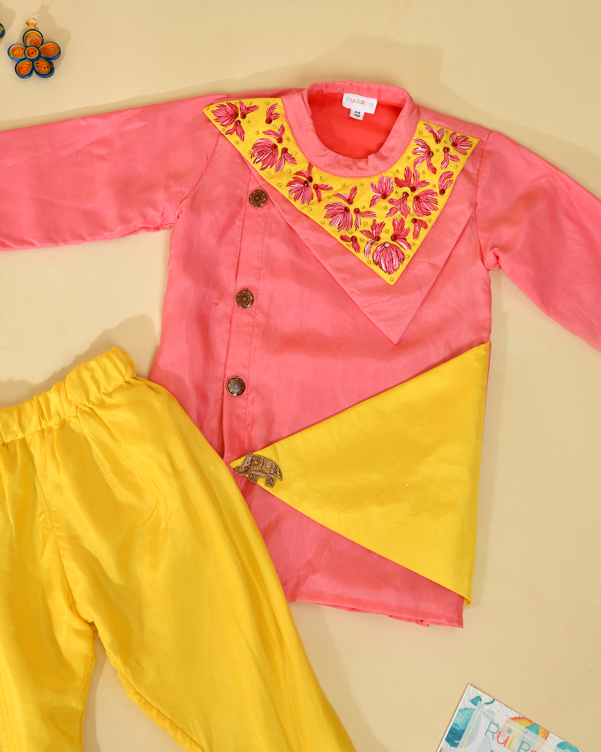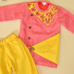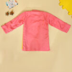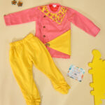 Rui Batte presents an exclusive party wear Modal Kurta Pajama set for kids, crafted with premium modal fabric for both kurta and pajama to ensure a soft, luxurious feel. Featuring elegant handpainted artwork highlighted with red stone embellishments, this outfit blends comfort with festive glamour. Designed for special occasions, it offers a refined ethnic look while remaining gentle on kids’ skin.