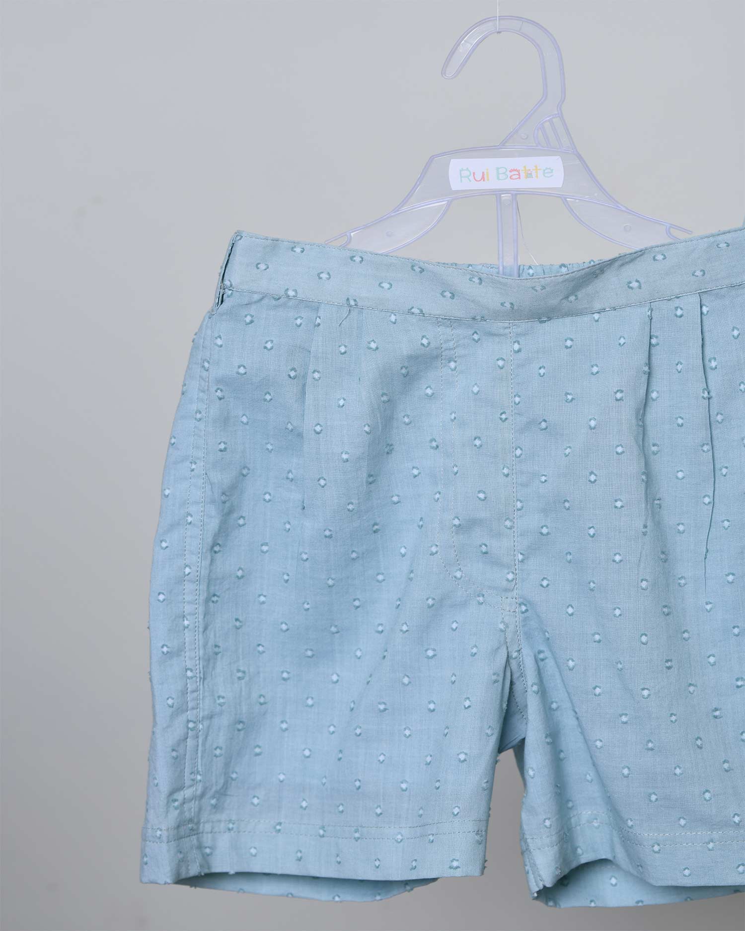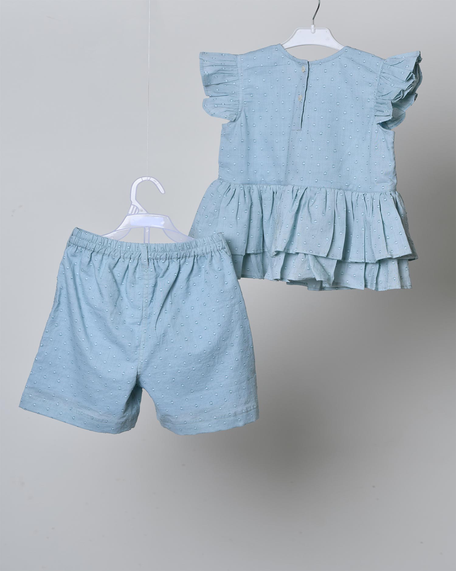Light blue cotton dobby top with ankle-length shorts Embellished flower detail on the side Gathered bottom for added charm Made from soft, breathable cotton Gentle wash recommended; wash light colors separately Perfect for casual and special occasions