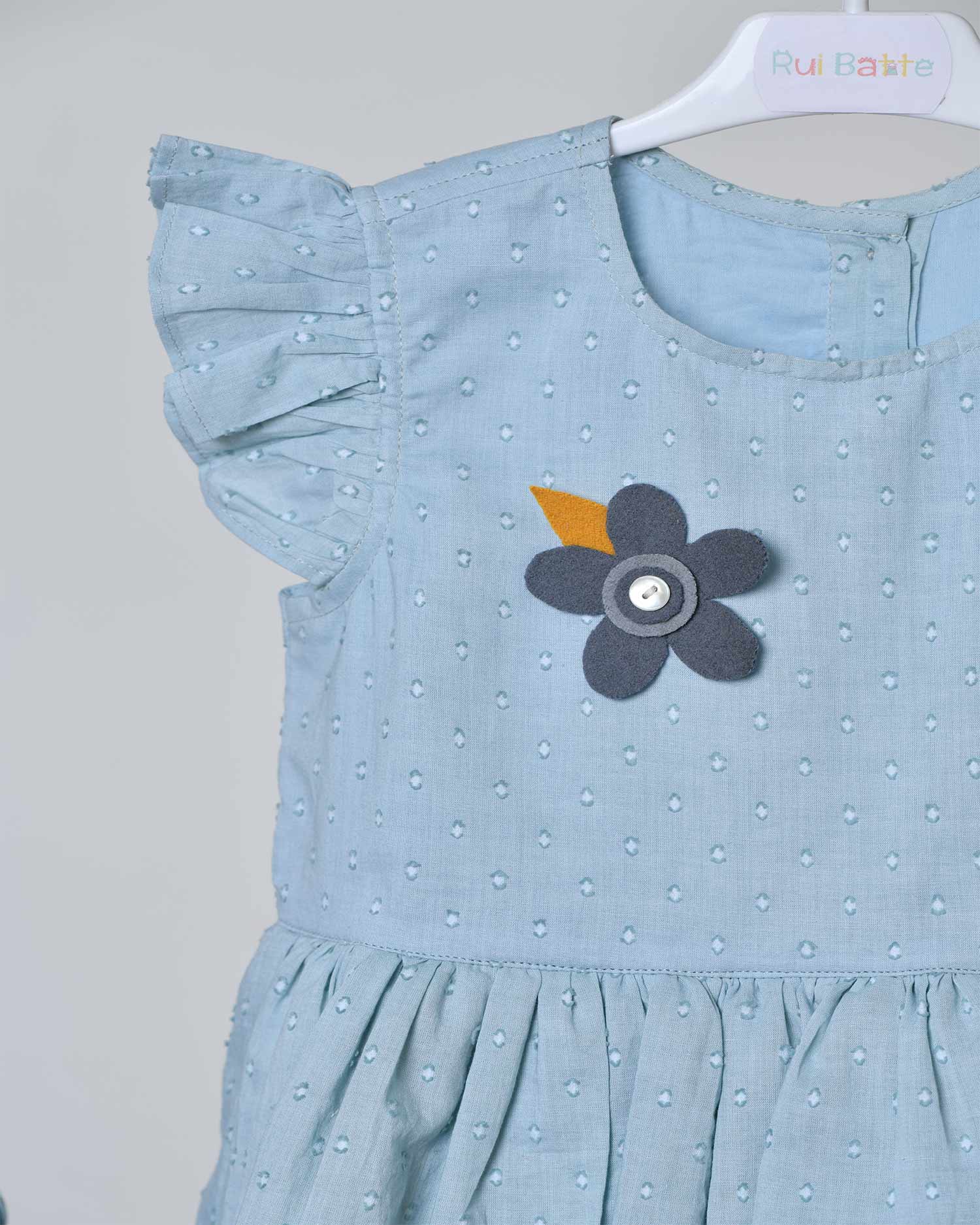 Dress your little one in style with our RuiBatte cotton dobby top paired with ankle-length shorts. Featuring a light blue frock design, the top is adorned with an elegant embellished flower and gathers at the bottom for a charming look. Made from soft cotton, it ensures comfort and is easy to care for with gentle wash instructions.