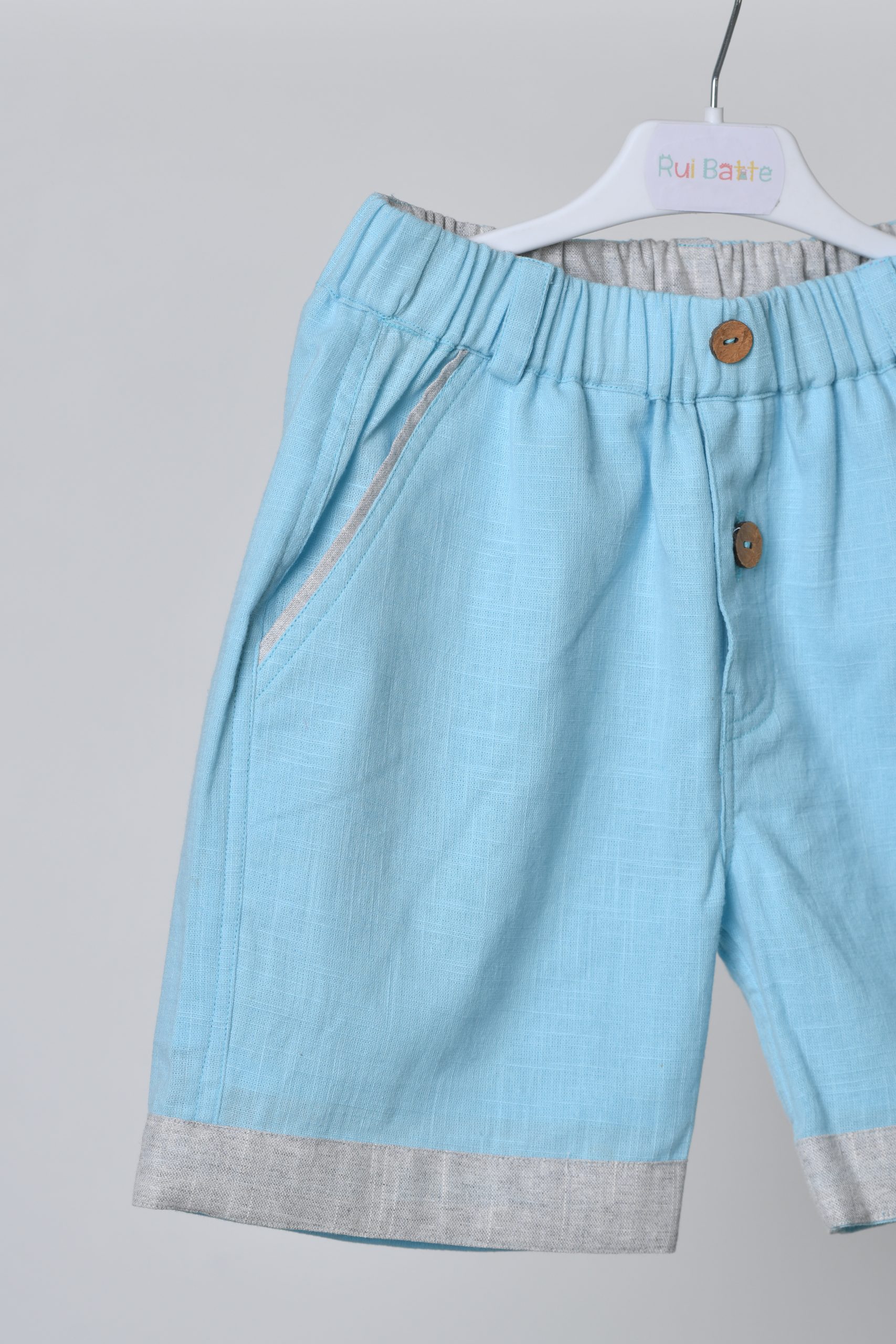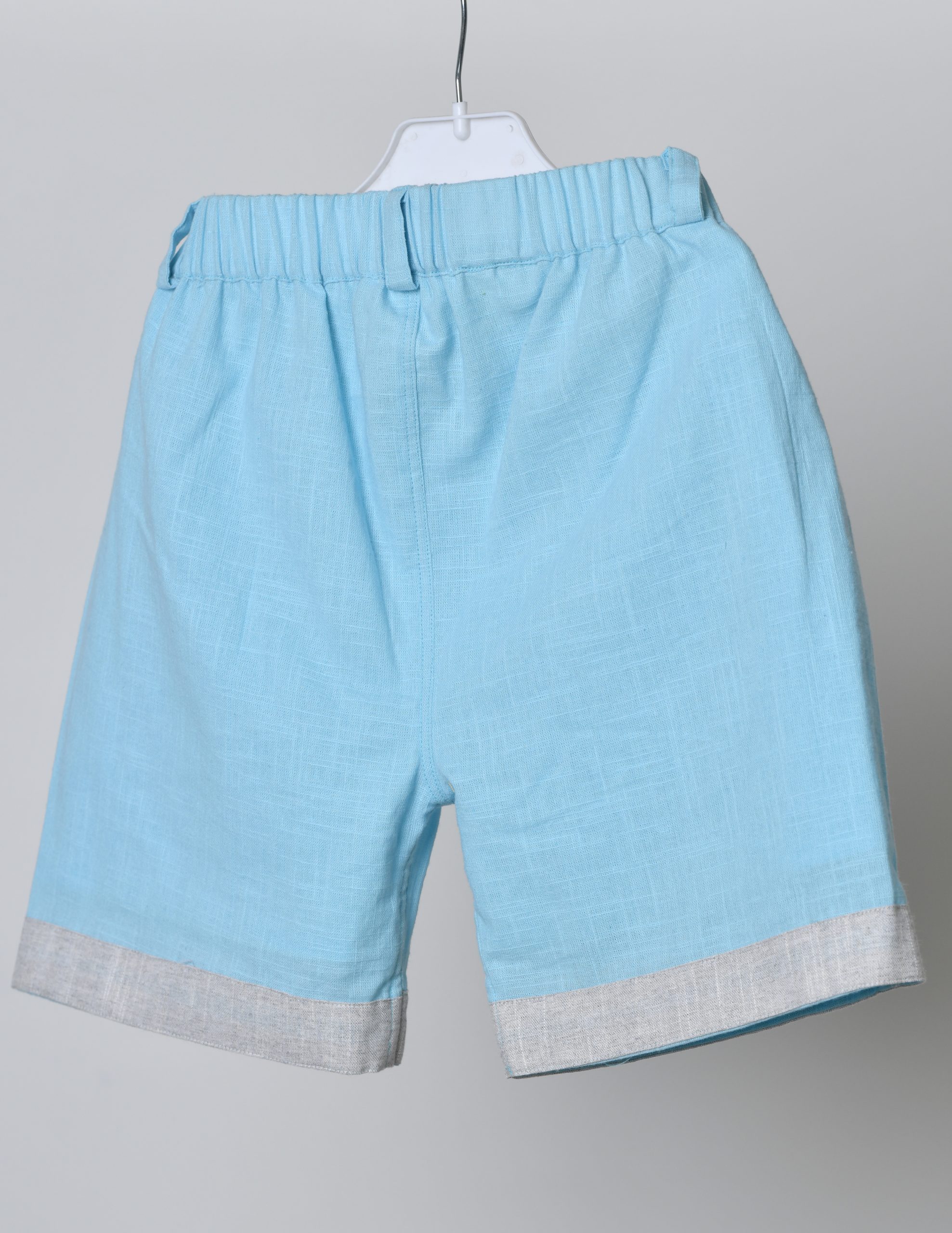 | this shorts is in sky blue cotton slab material with lining and wood buttons. |
