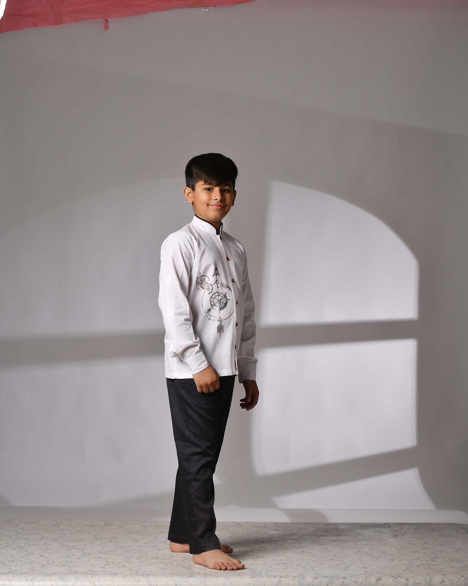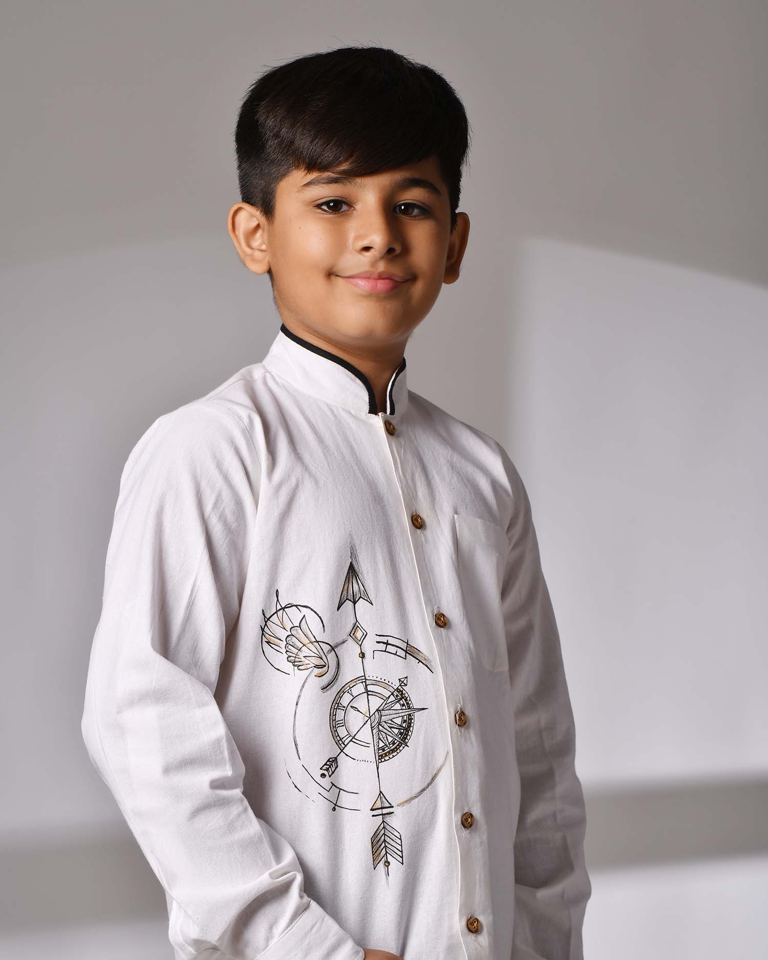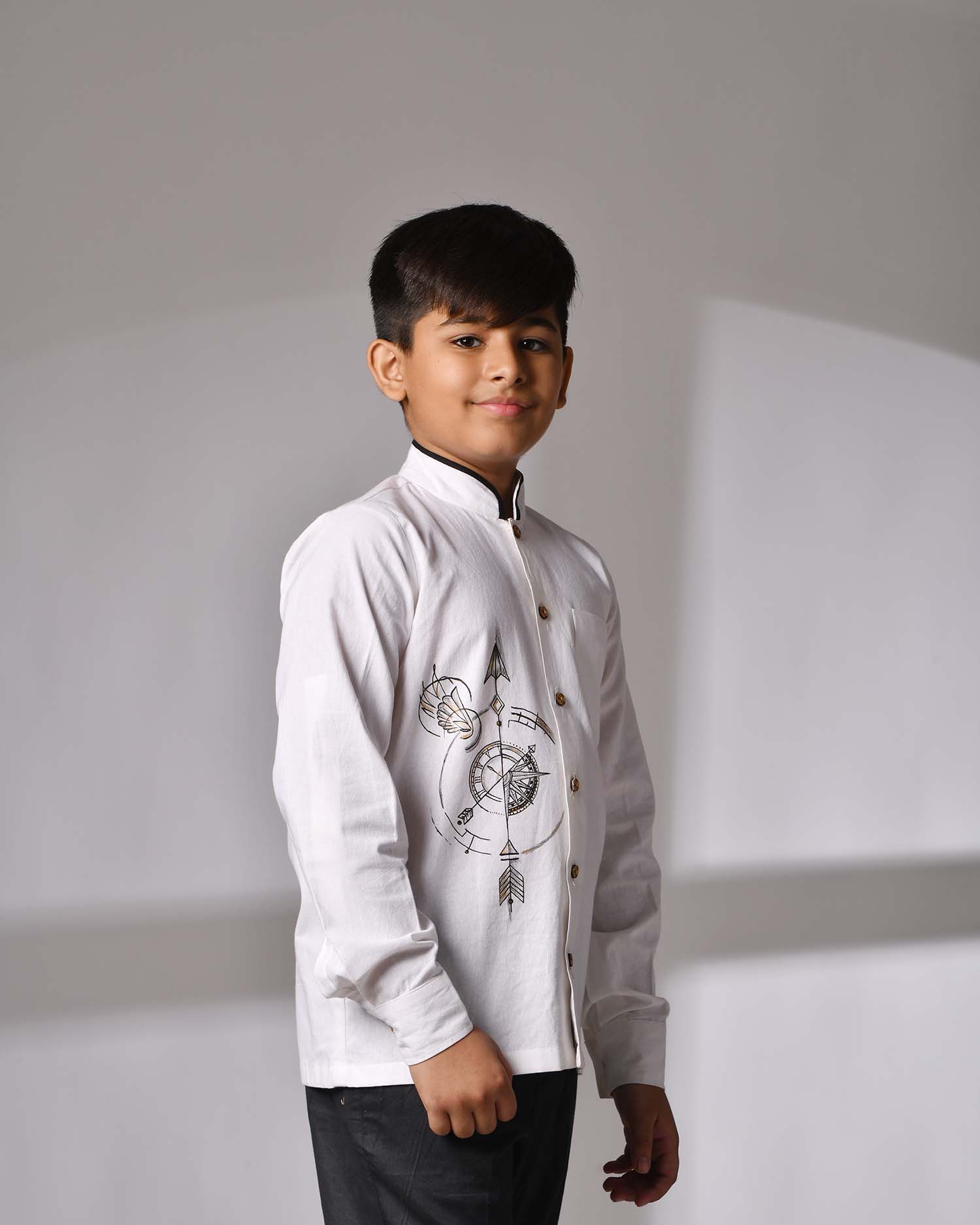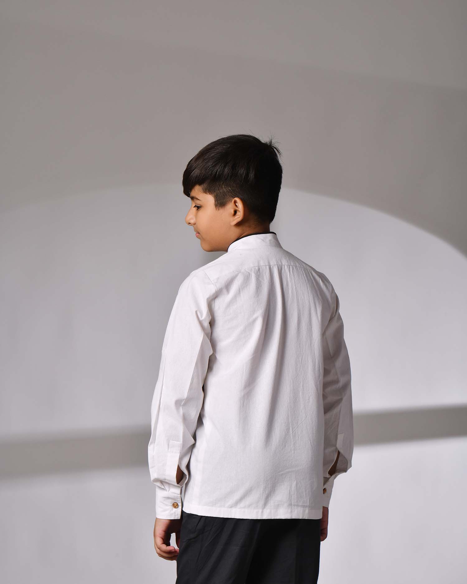 White solid opaque Casual shirt has a mandarin collar, button placket, 1 pocket, long roll-up sleeves, curved hem.