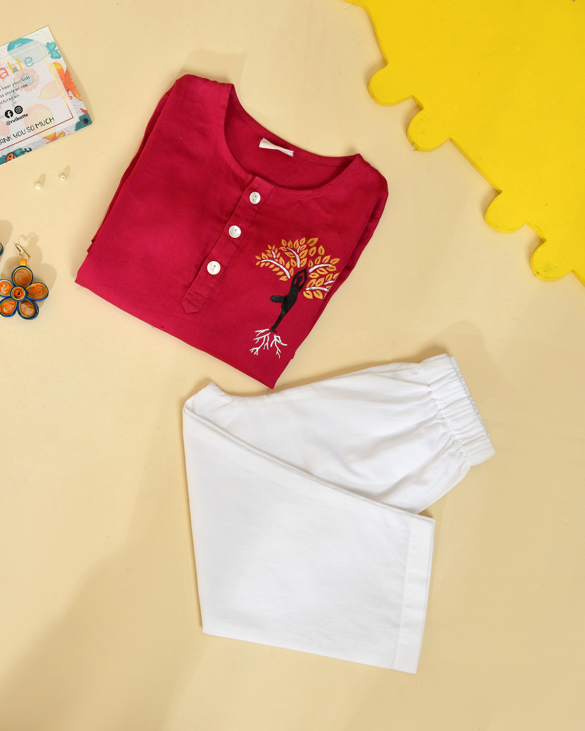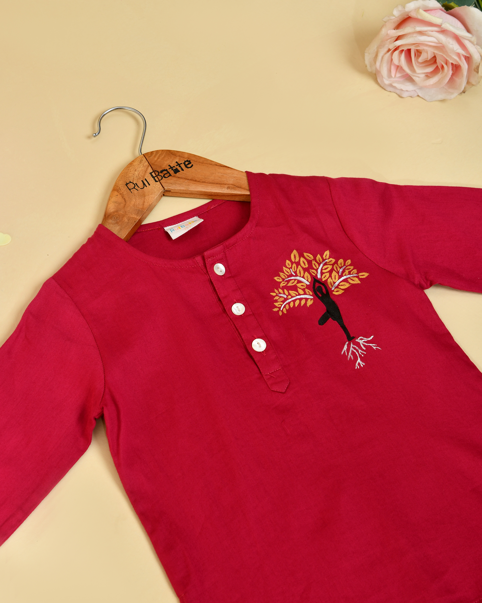 Rui Batte presents premium handpainted Kurta Pajama sets crafted with smooth glace cotton for the kurta and soft cotton for the pajama, ensuring superior comfort and breathability for kids. Designed with artistic detailing and eco-friendly fabrics, each outfit reflects individuality and traditional elegance. This kids ethnic wear is gentle on skin and ideal for festive occasions, cultural events, and special celebrations.